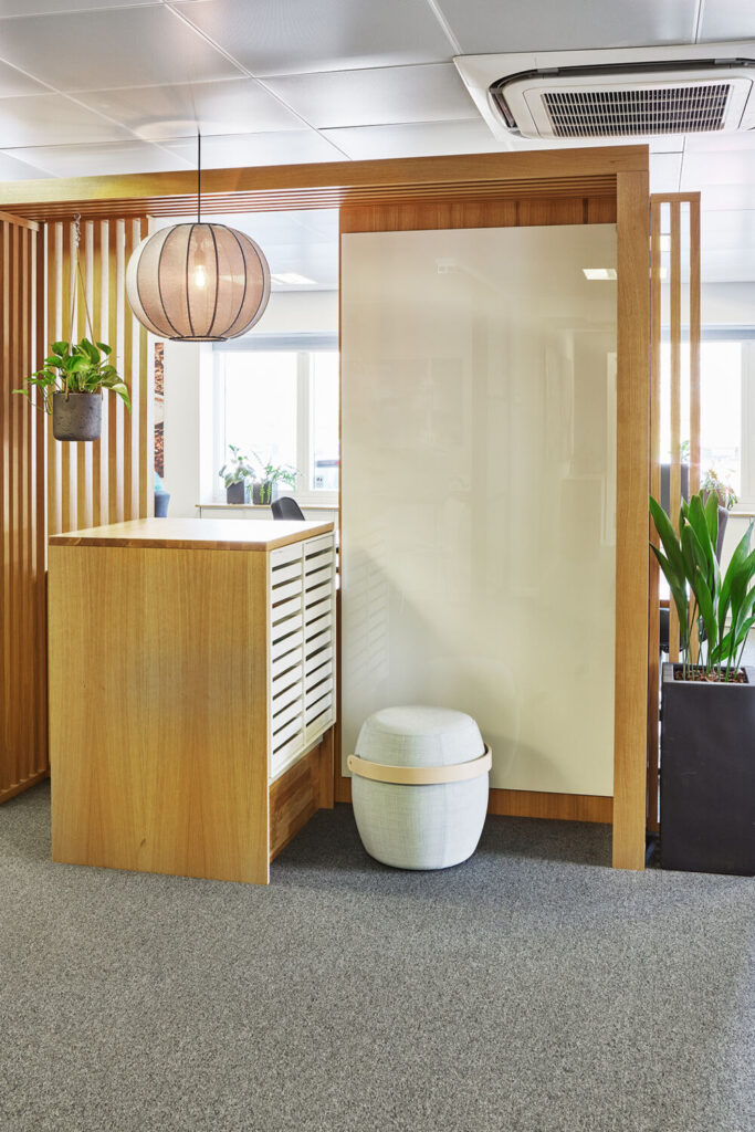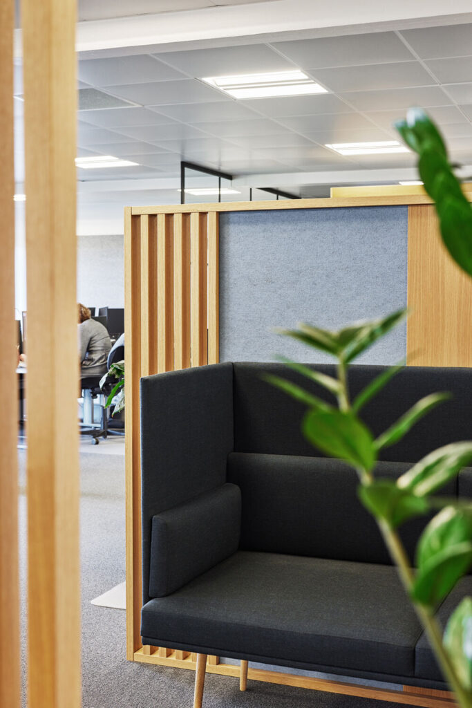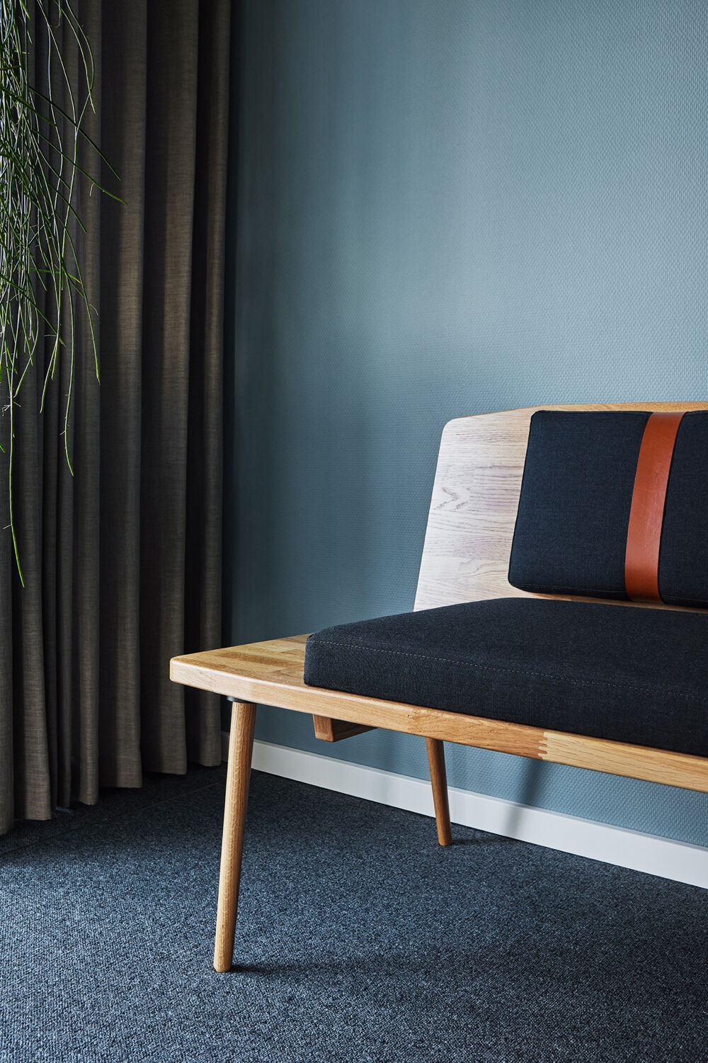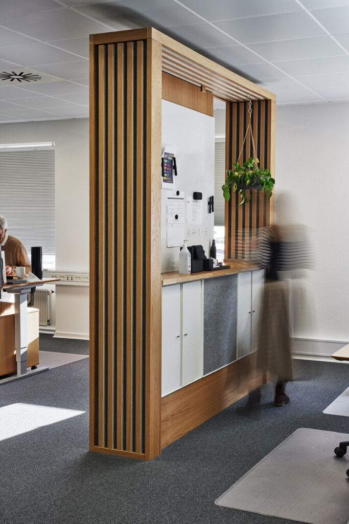 Med de forskellige rumdelere og paneler har vi arbejdet på forbedring af akustik i alle rum. Til dette brugte vi tekstil fra Kvadrat.