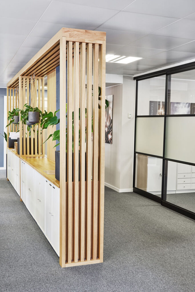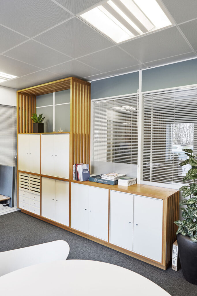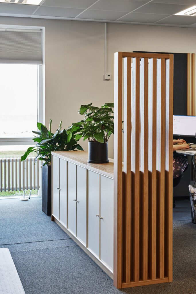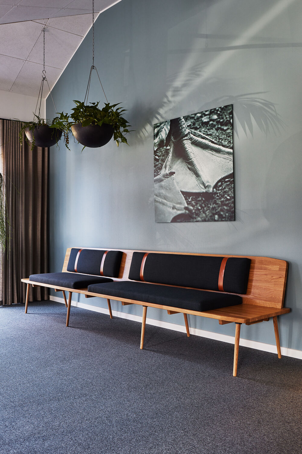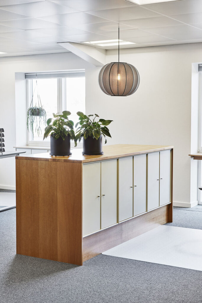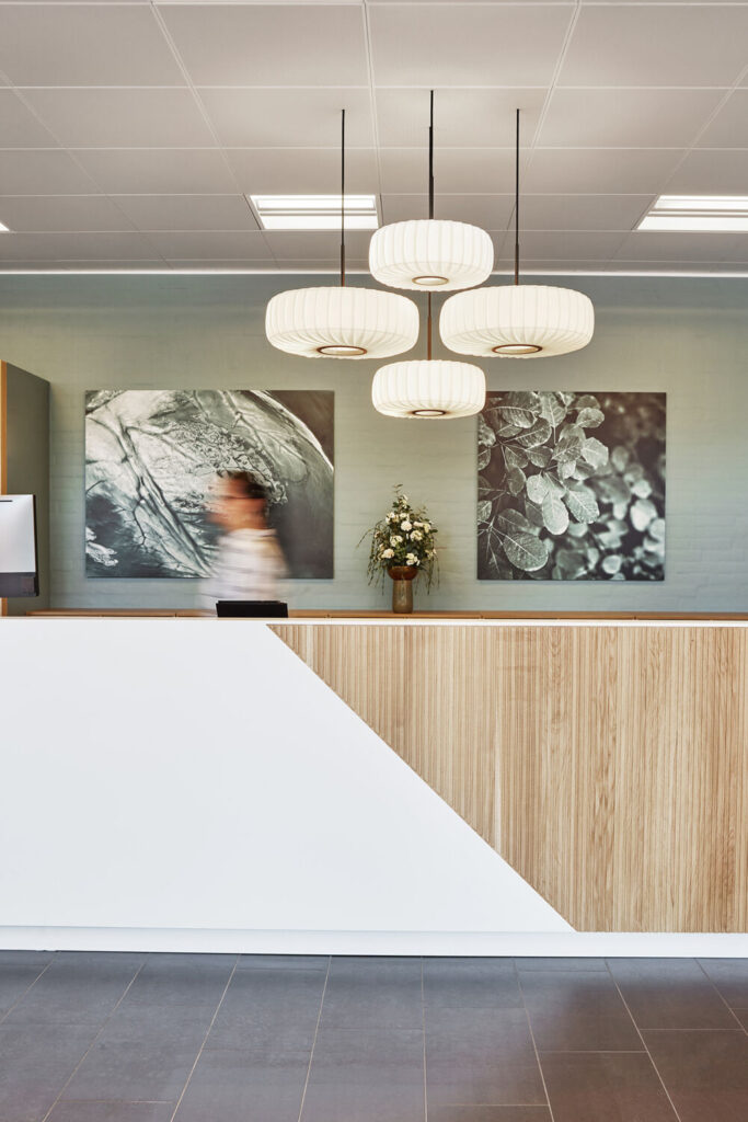 Receptionen fik en ny skranke fremstillet af hvid Corian og massiv eg. Og gennemgående i virksomheden har vi sammen med Arkitekt & rum, arbejdet på at give medarbejderne en funktionel hverdag med god opbevaring, praktiske løsninger, siddepladser og hyggelig stemning.