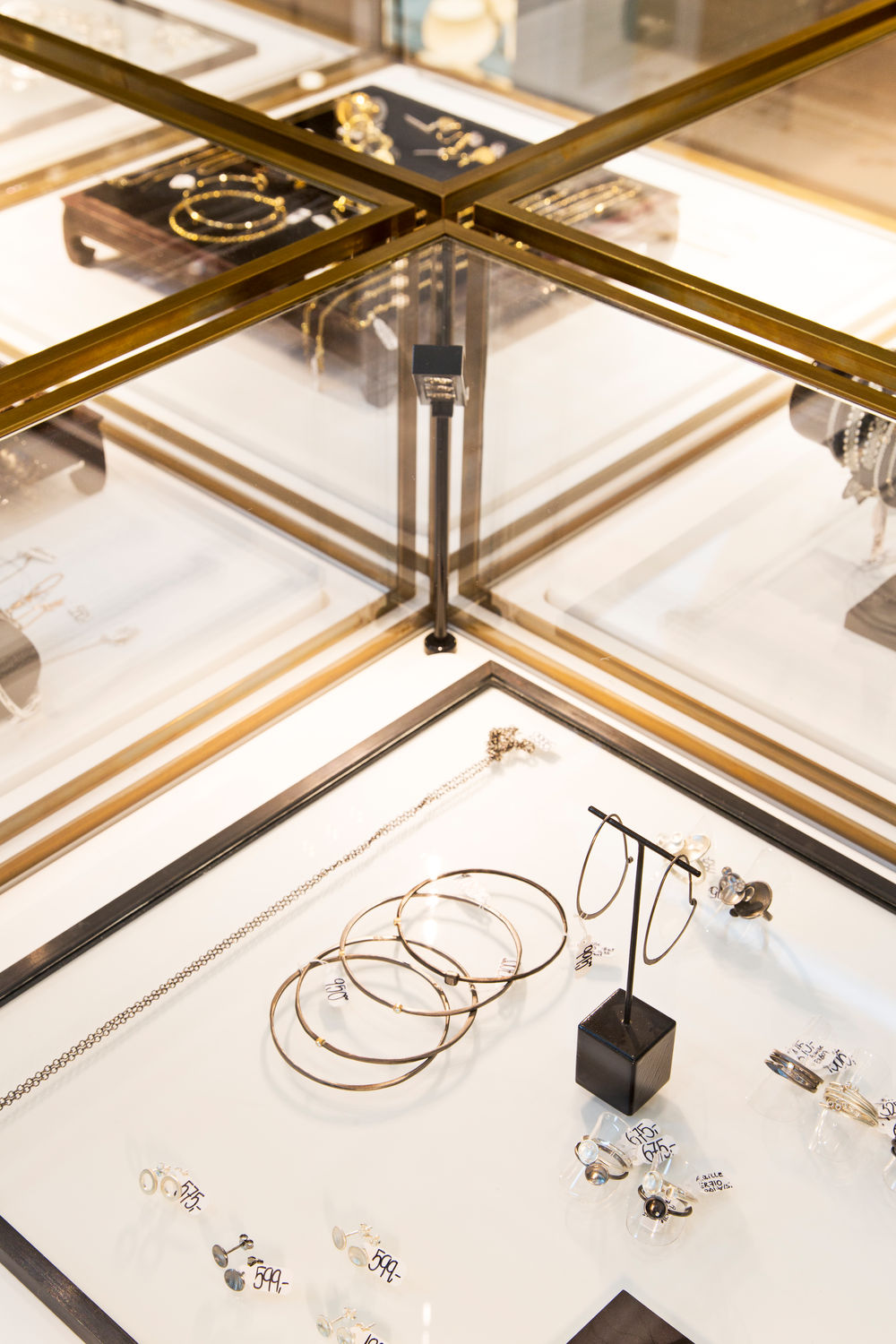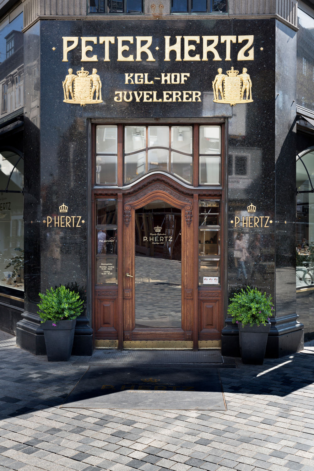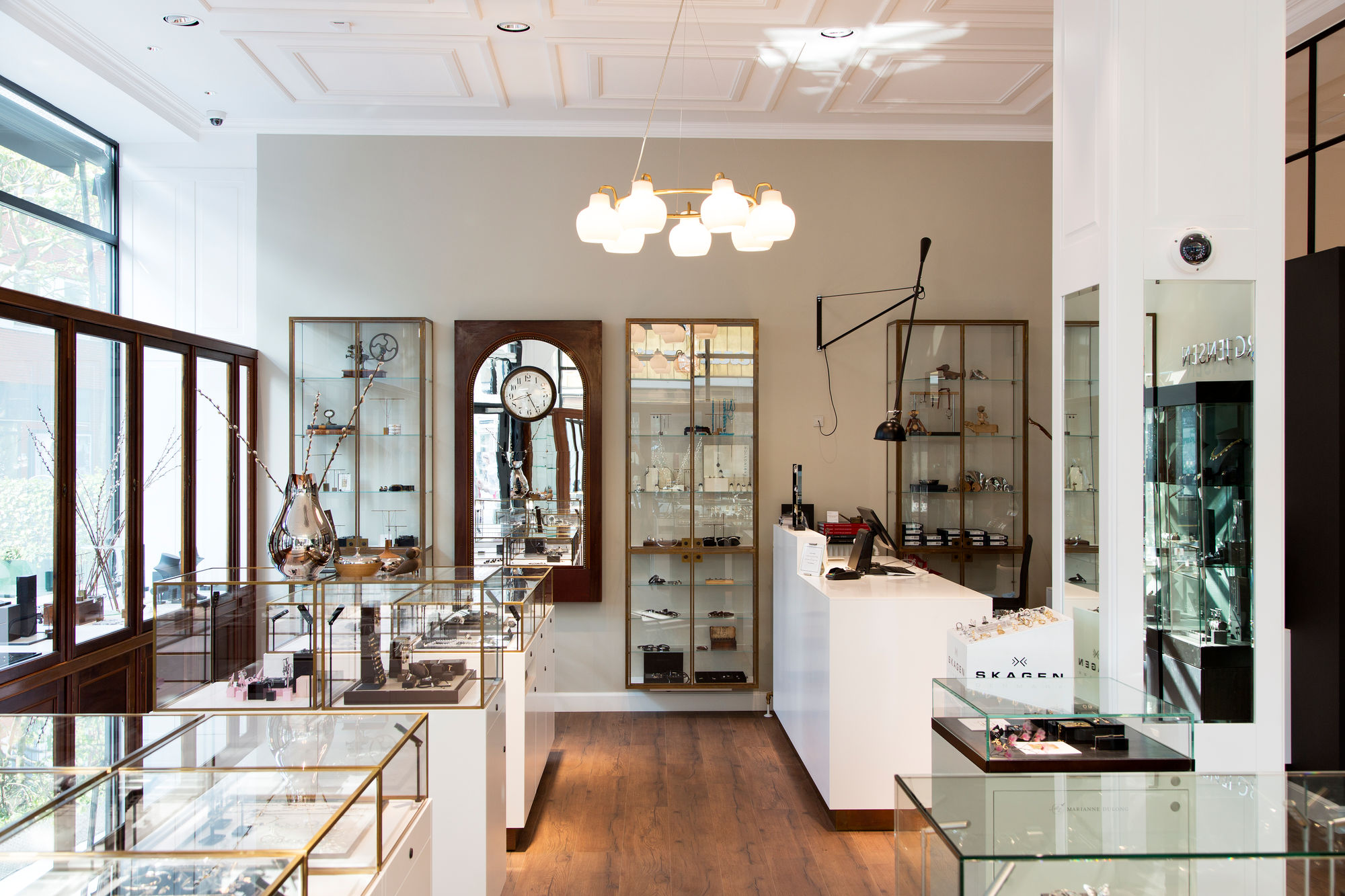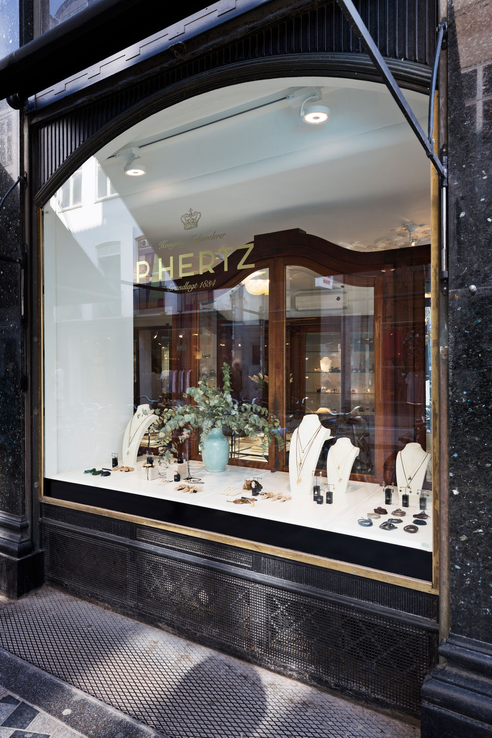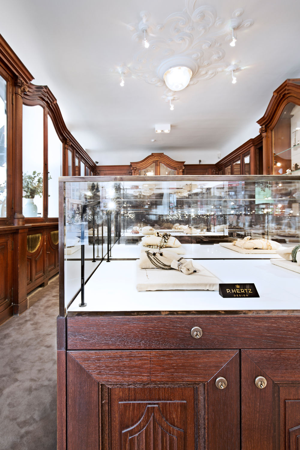 Kombinationen imellem de nye møbler og elementer som de originale gamle vitriner, et antikt spejl og kasseapparat får butikken til at fremstå lys og indbydende samtidig med at respekten for bygningens historie og generationers stolthed i guldsmedefaget bevares.