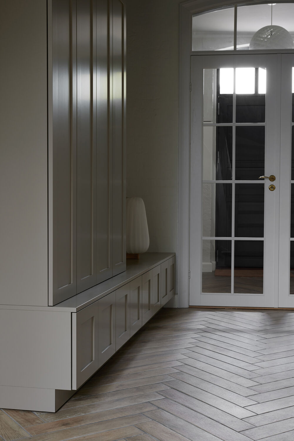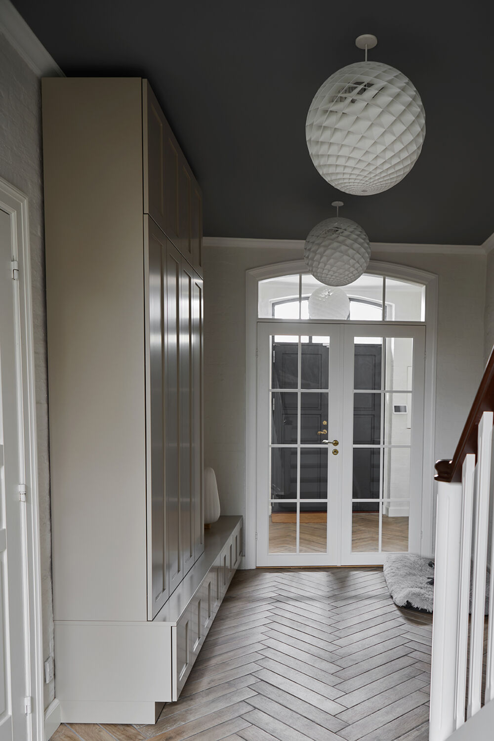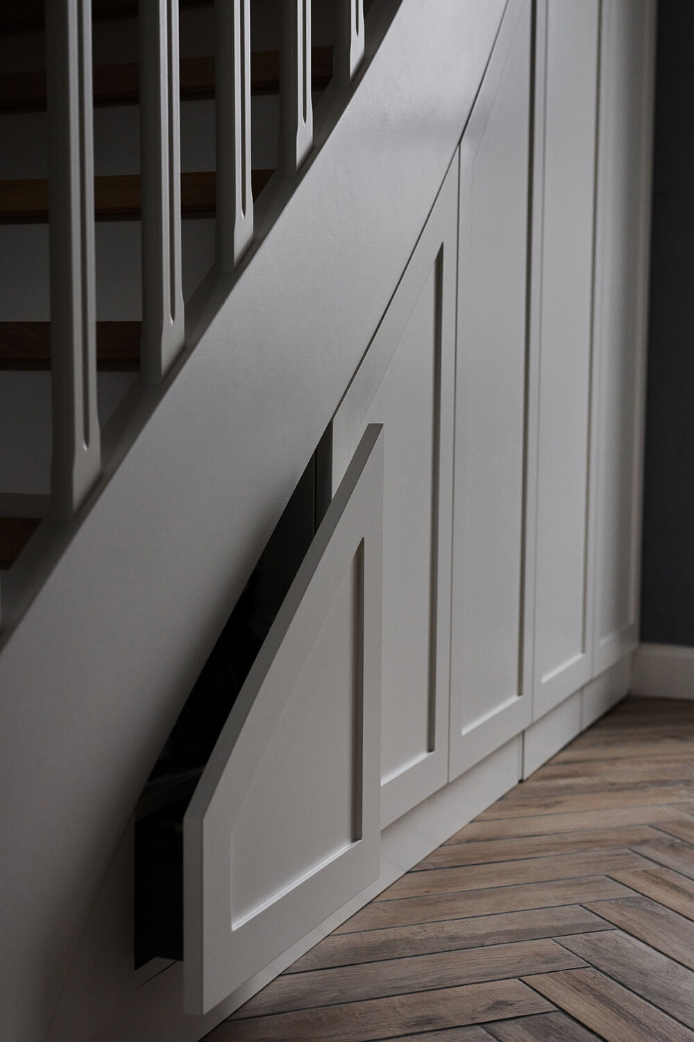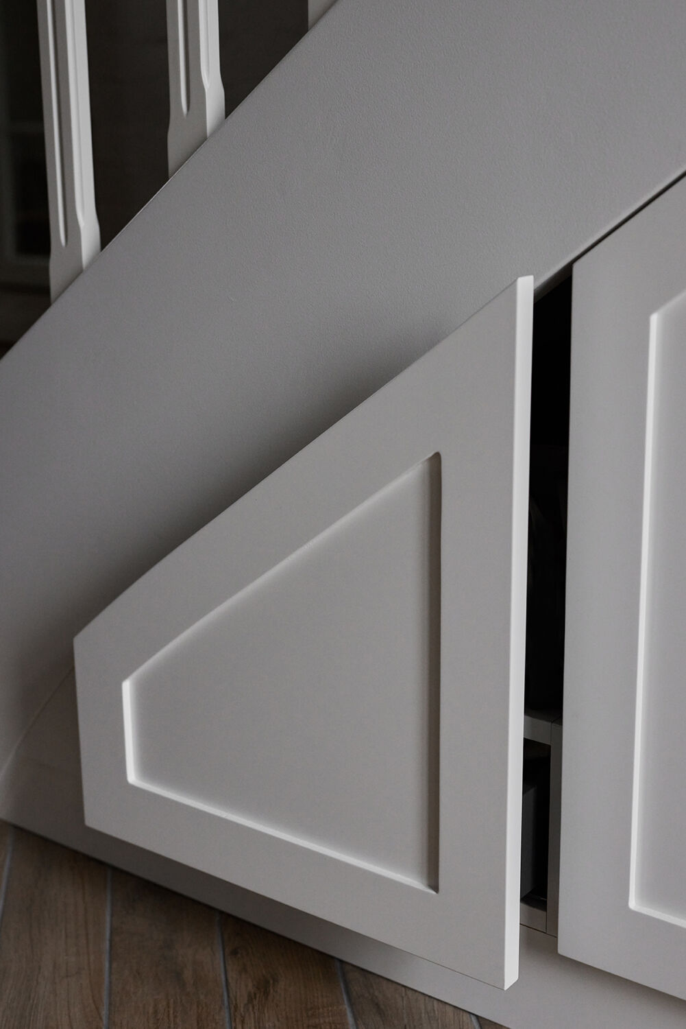 Til dette skønne hjem byggede vi en skabsvæg under trappen, samt stort skab fra gulv til loft i samme rum. Derudover udarbejdede vi sammen med kunden, et sminkebord, spejl, bænke og radiatorskjulere.