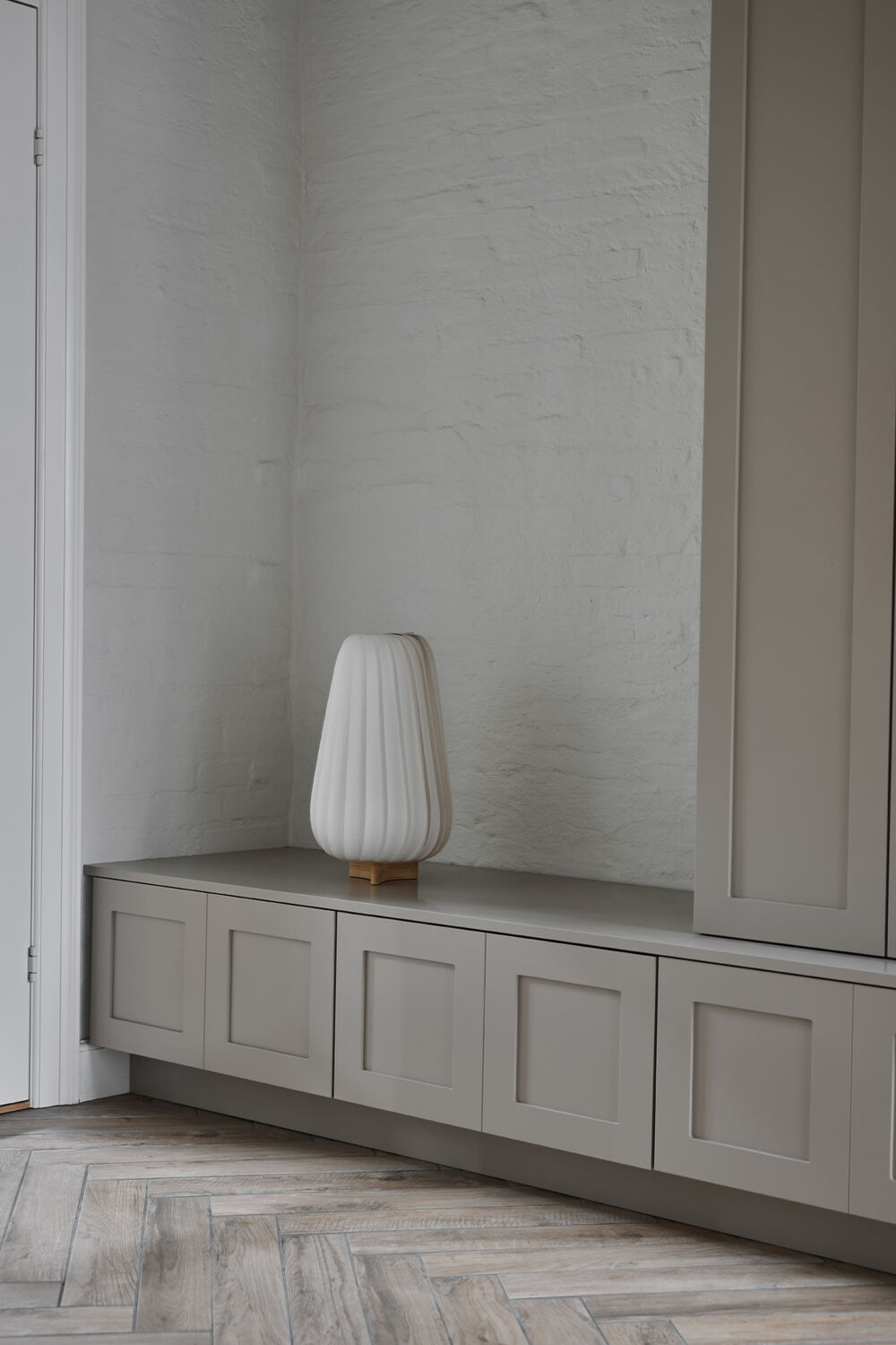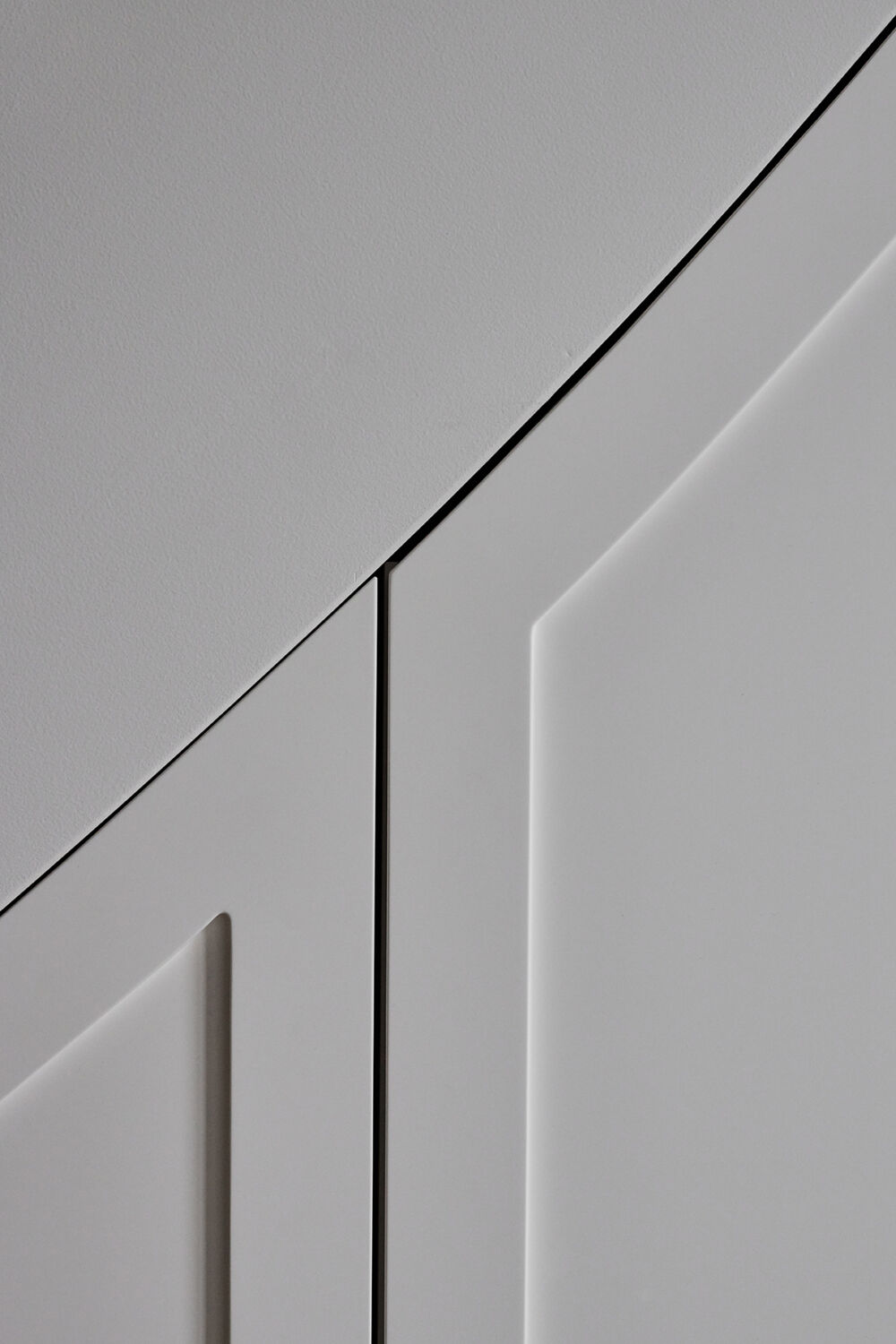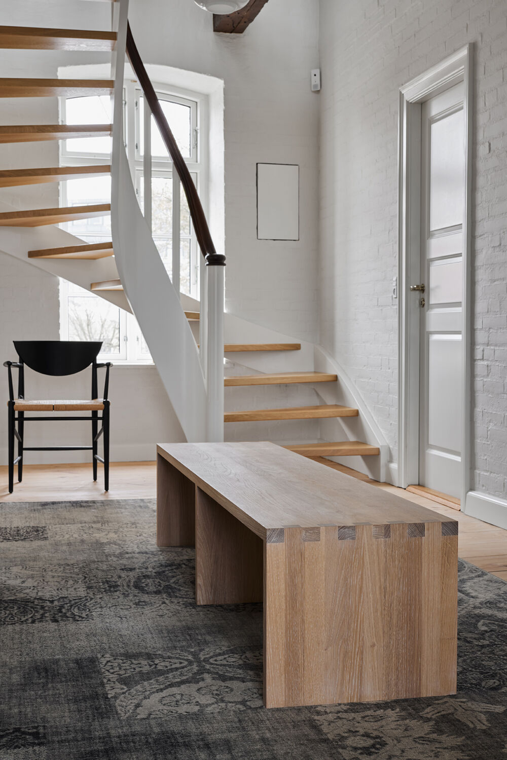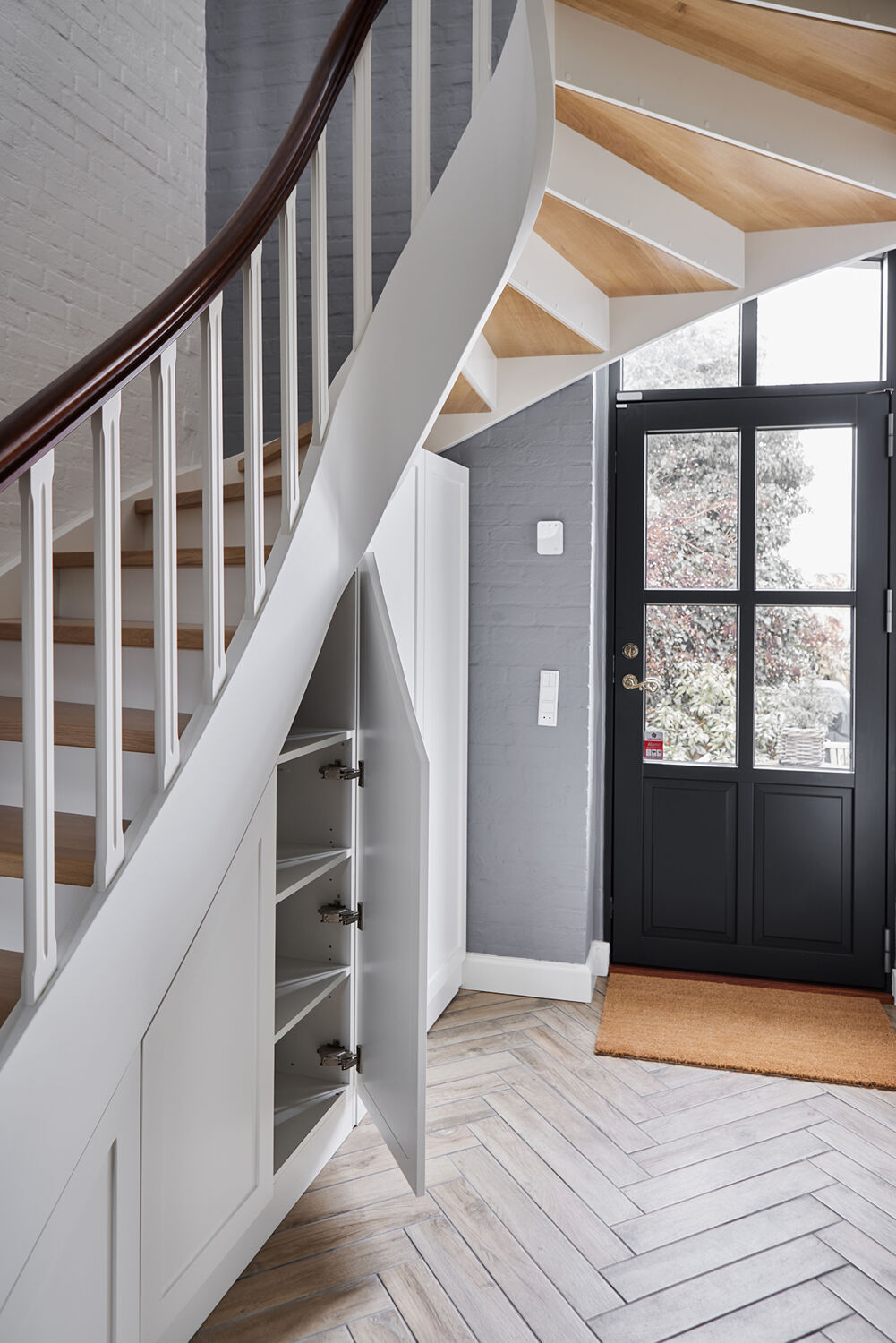 Til dette skønne hjem byggede vi en skabsvæg under trappen, samt stort skab fra gulv til loft i samme rum. Derudover udarbejdede vi sammen med kunden, et sminkebord, spejl, bænke og radiatorskjulere.