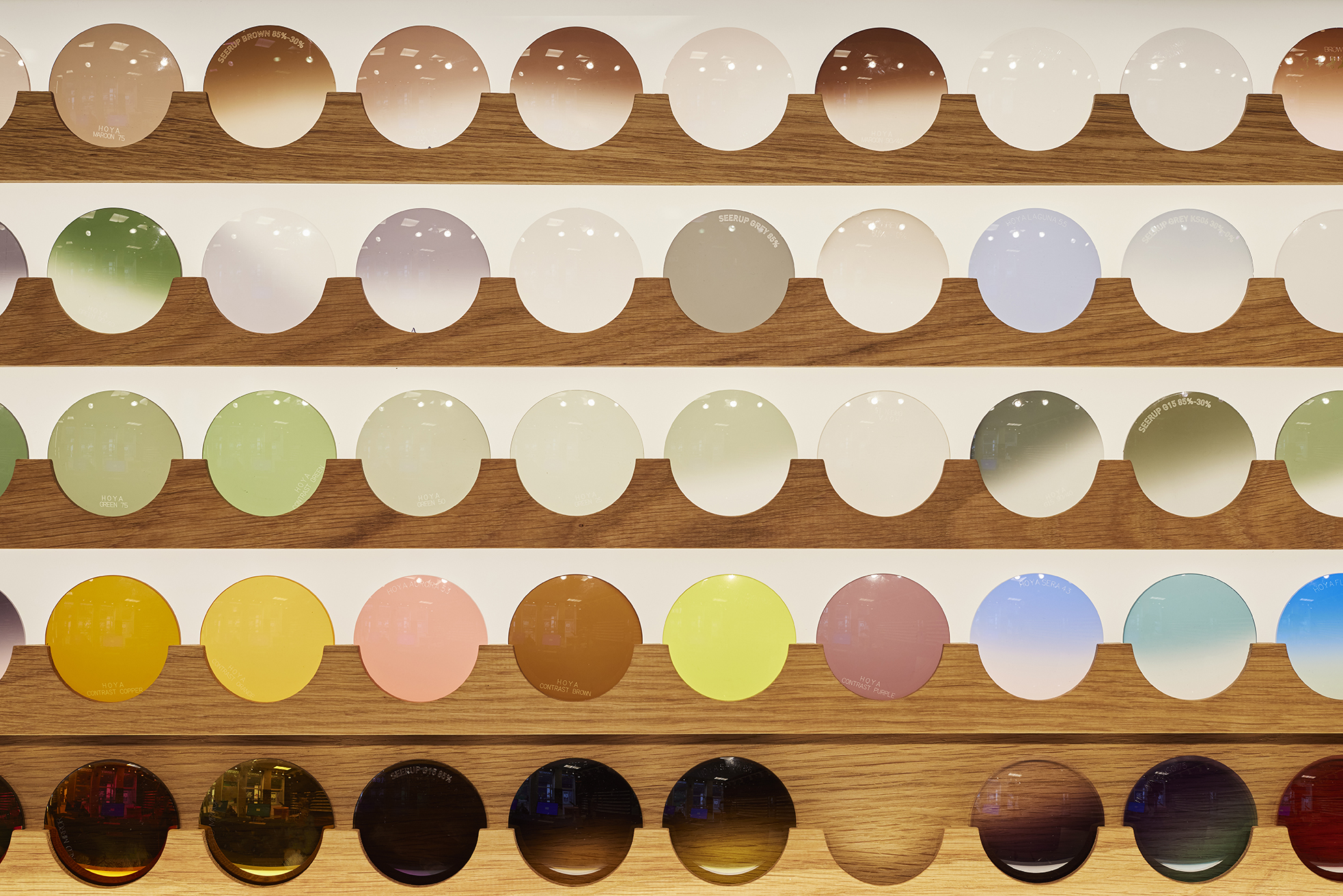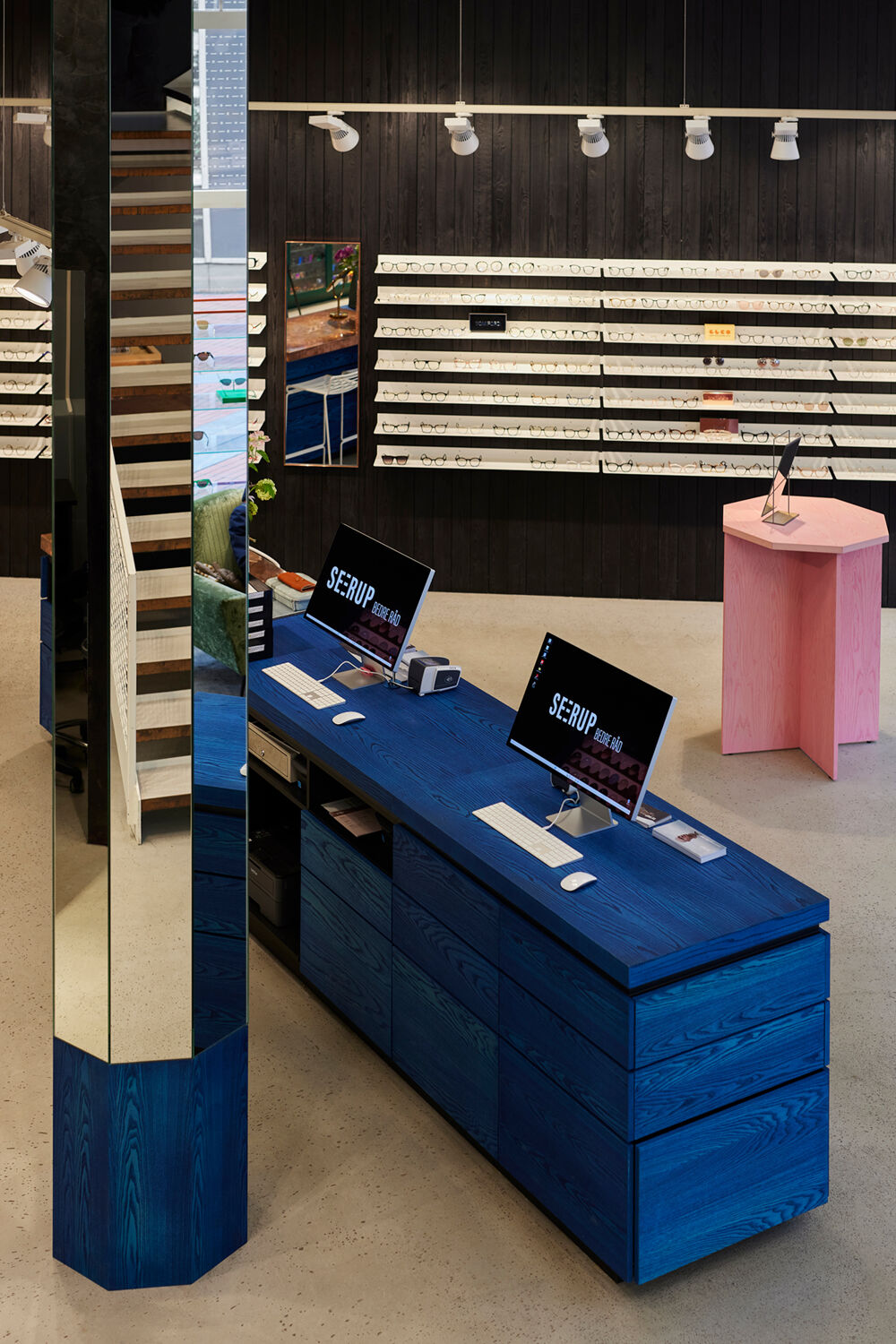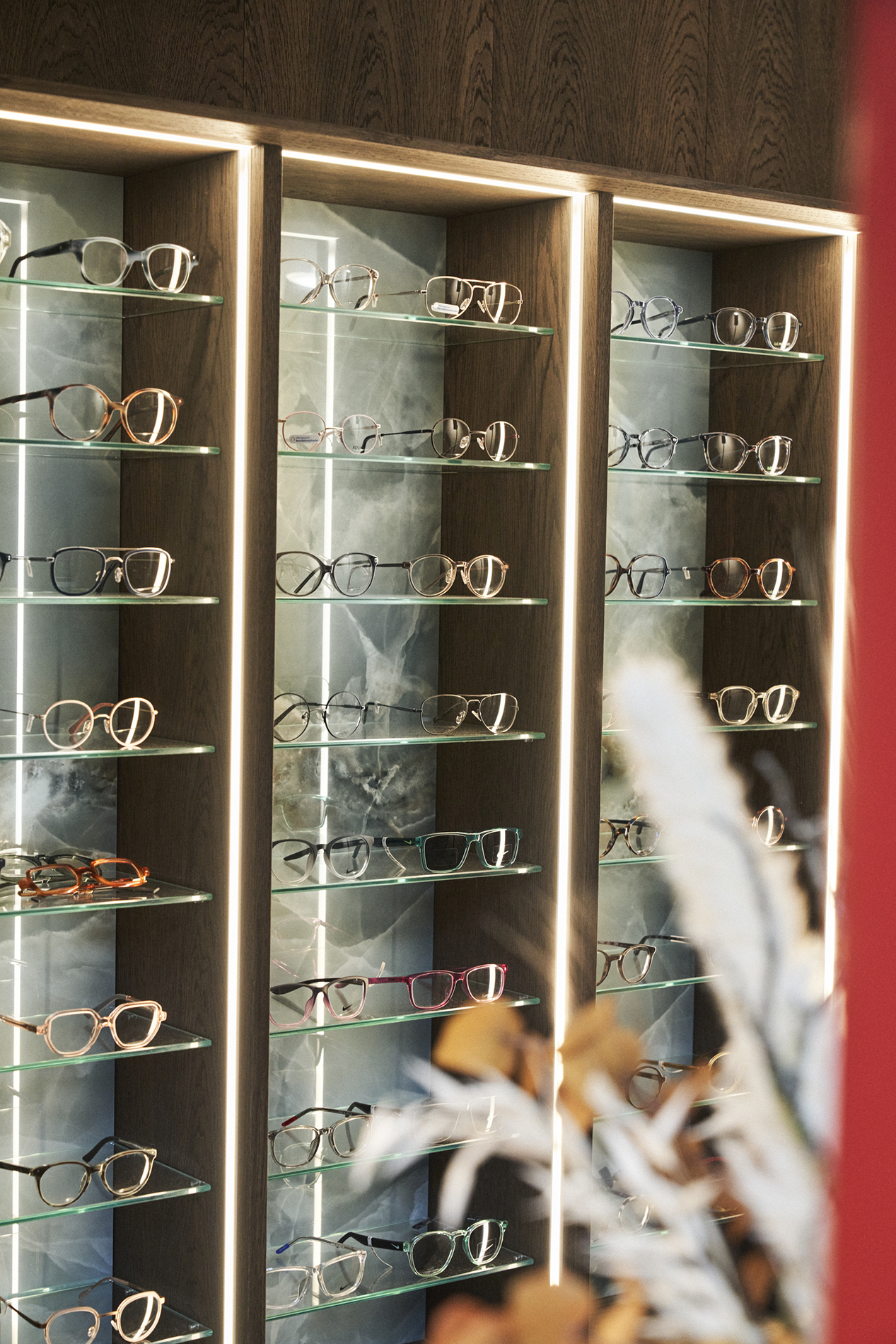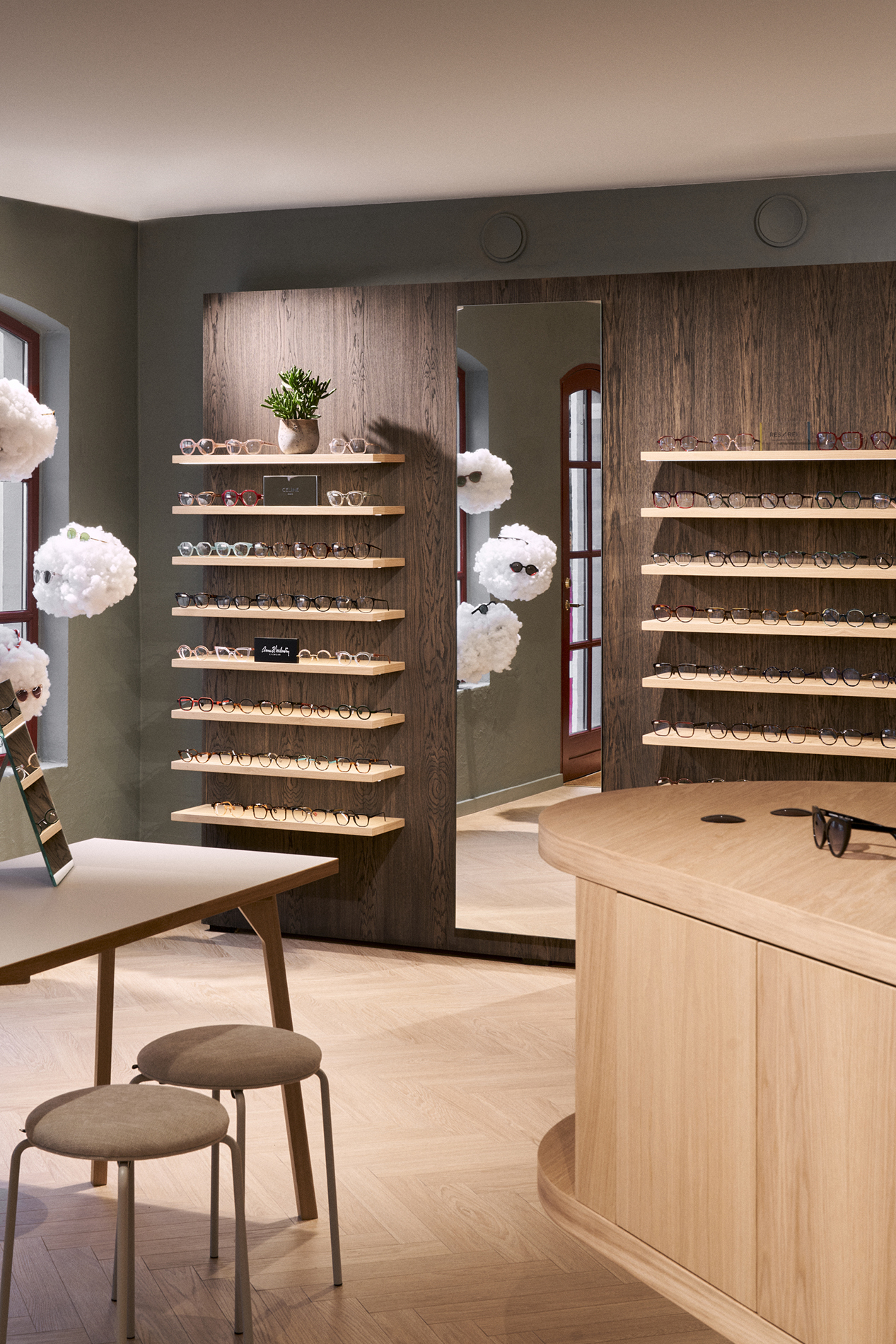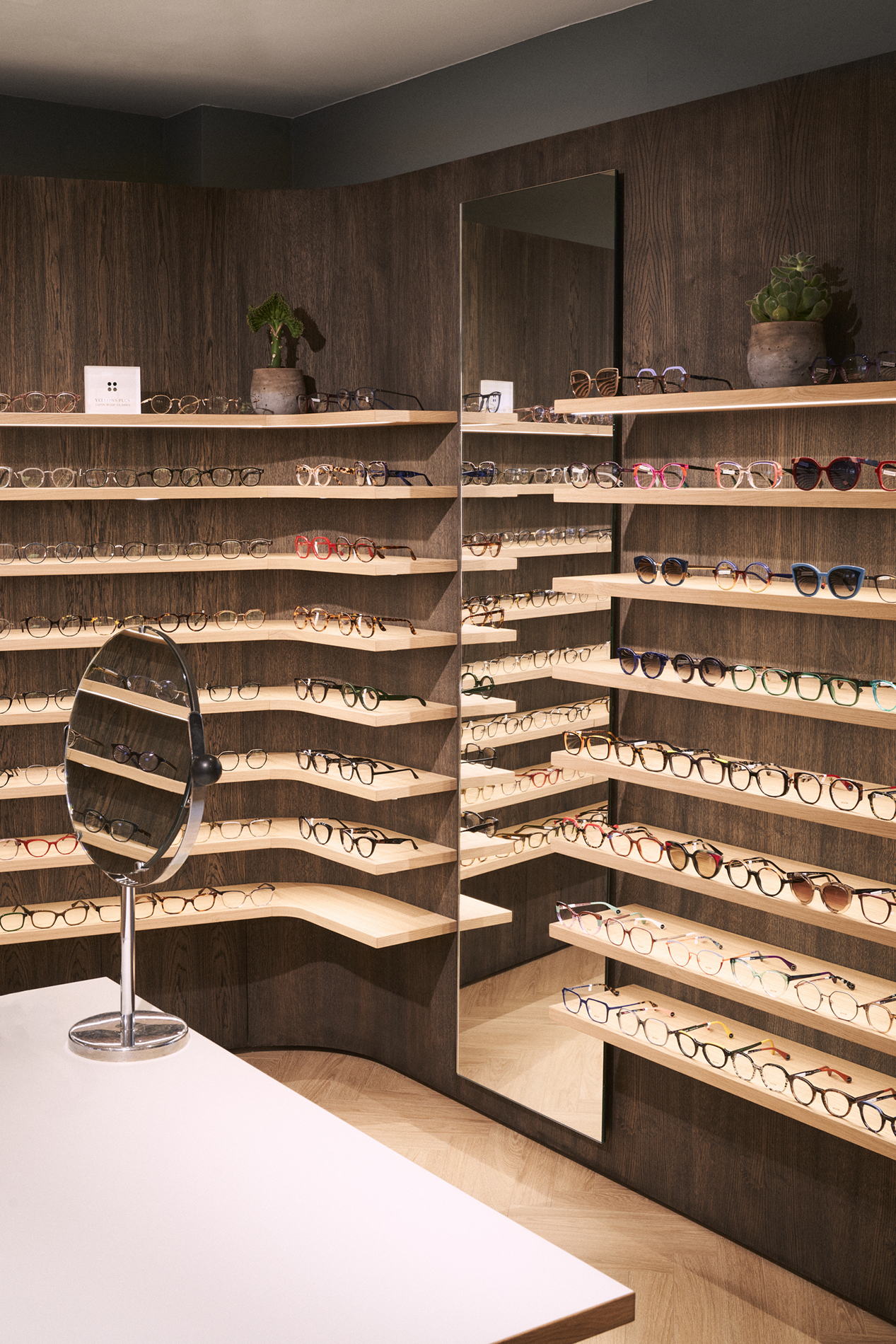 Indretningen er bygget op omkring specialfremstillet inventar i træ, der kombinerer funktionalitet med et organisk formsprog. Langs væggene løber svævende væghylder, der bevæger sig rundt i rummet i en blød, bølgende form og skaber dynamik samt inviterer til opdagelse. Skræddersyede reoler med integreret LED-lys præsenterer brillestel på en elegant og overskuelig måde.