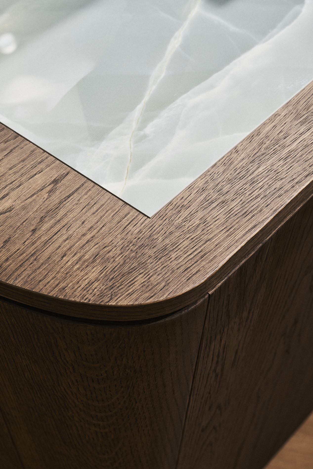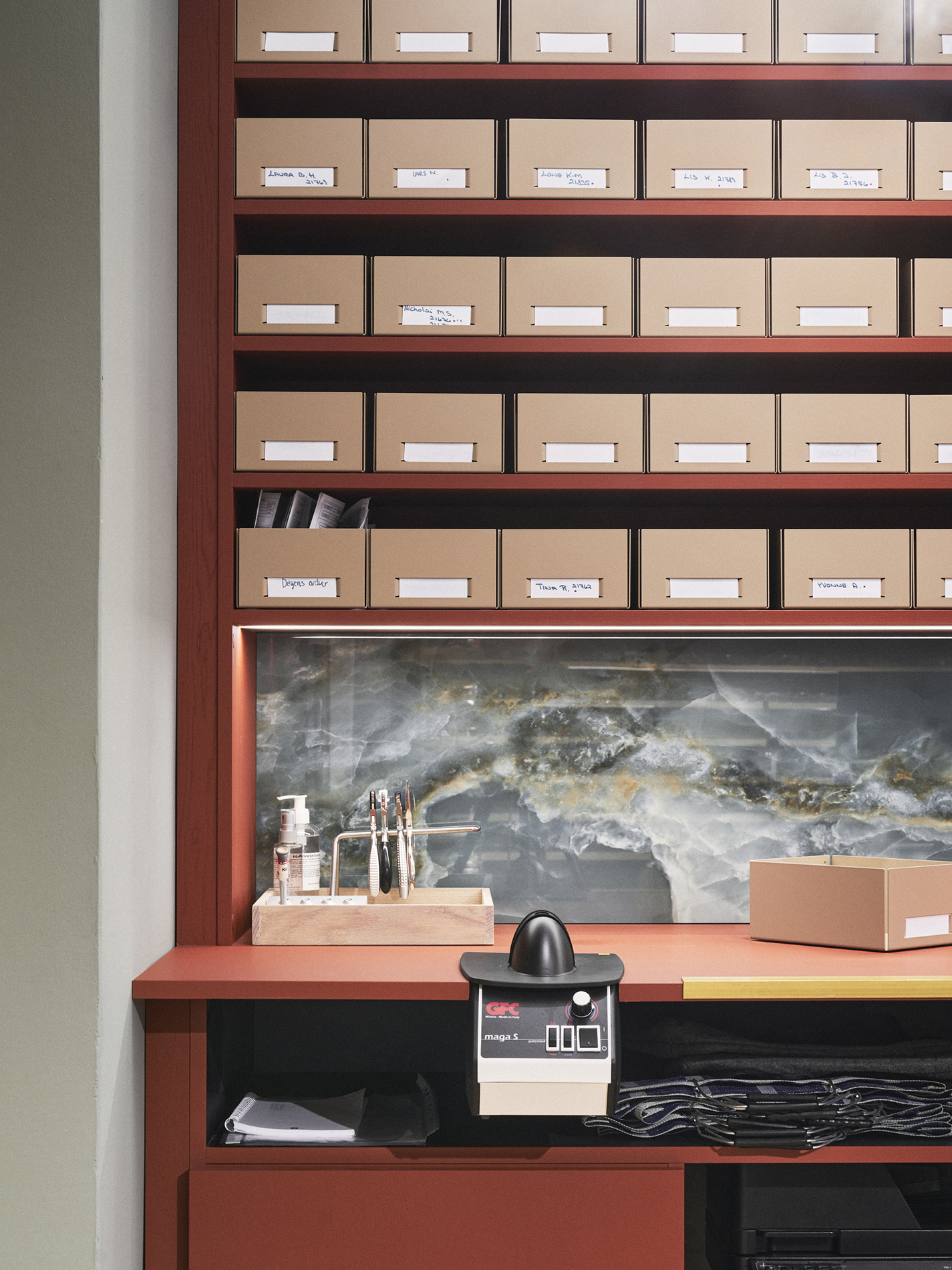 Diskområdet er udført i træ med runde, indbydende former, der bryder med de skarpe linjer og giver rummet karakter og varme. En vægmonteret disk fungerer som et let og åbent arbejdsområde, mens et brilleglasdisplay er udarbejdet med samme sans for detaljer og materialevalg.