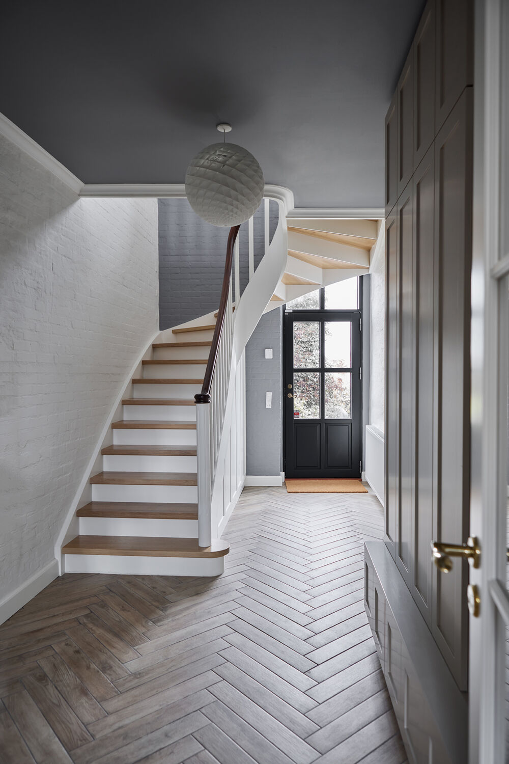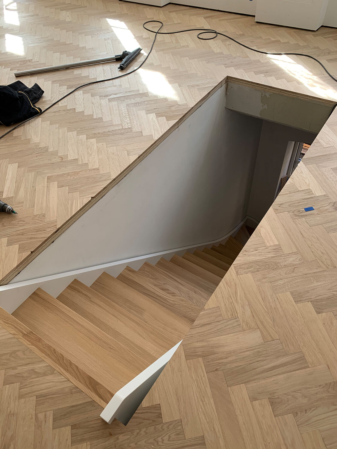 Til dette projekt fik vi blandt andet lov til at udarbxejde et nyt køkken, en trappe med lys, skillevæg med skydedøre og meget mere.