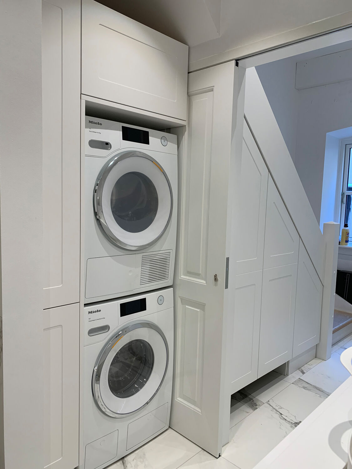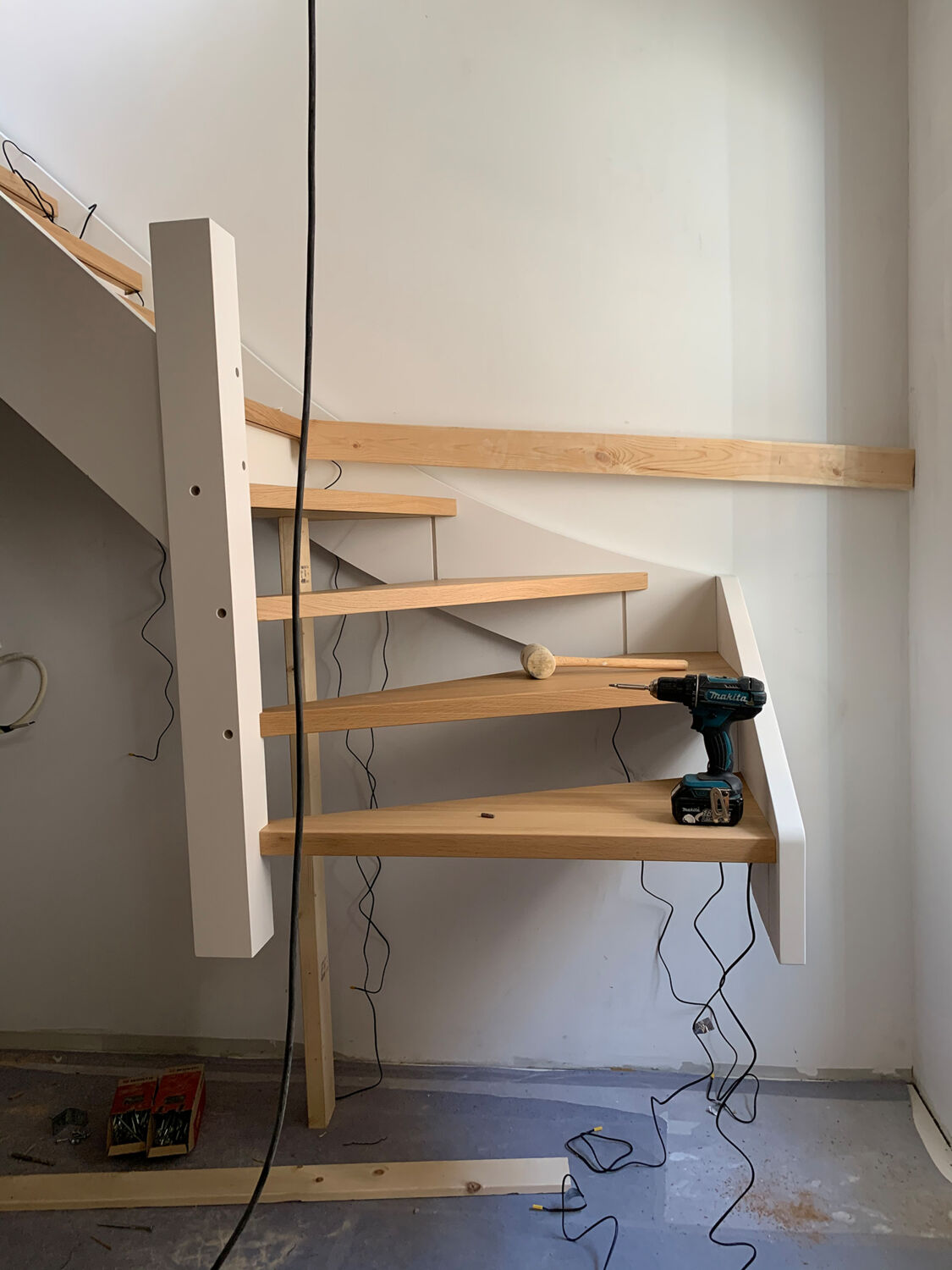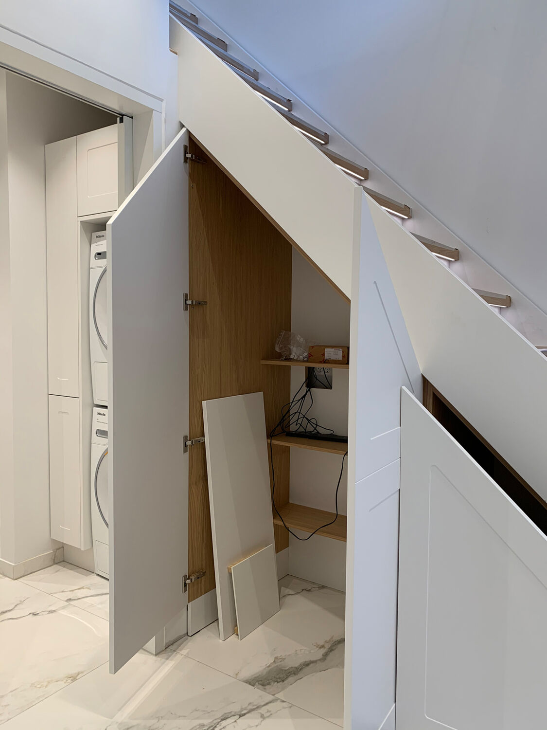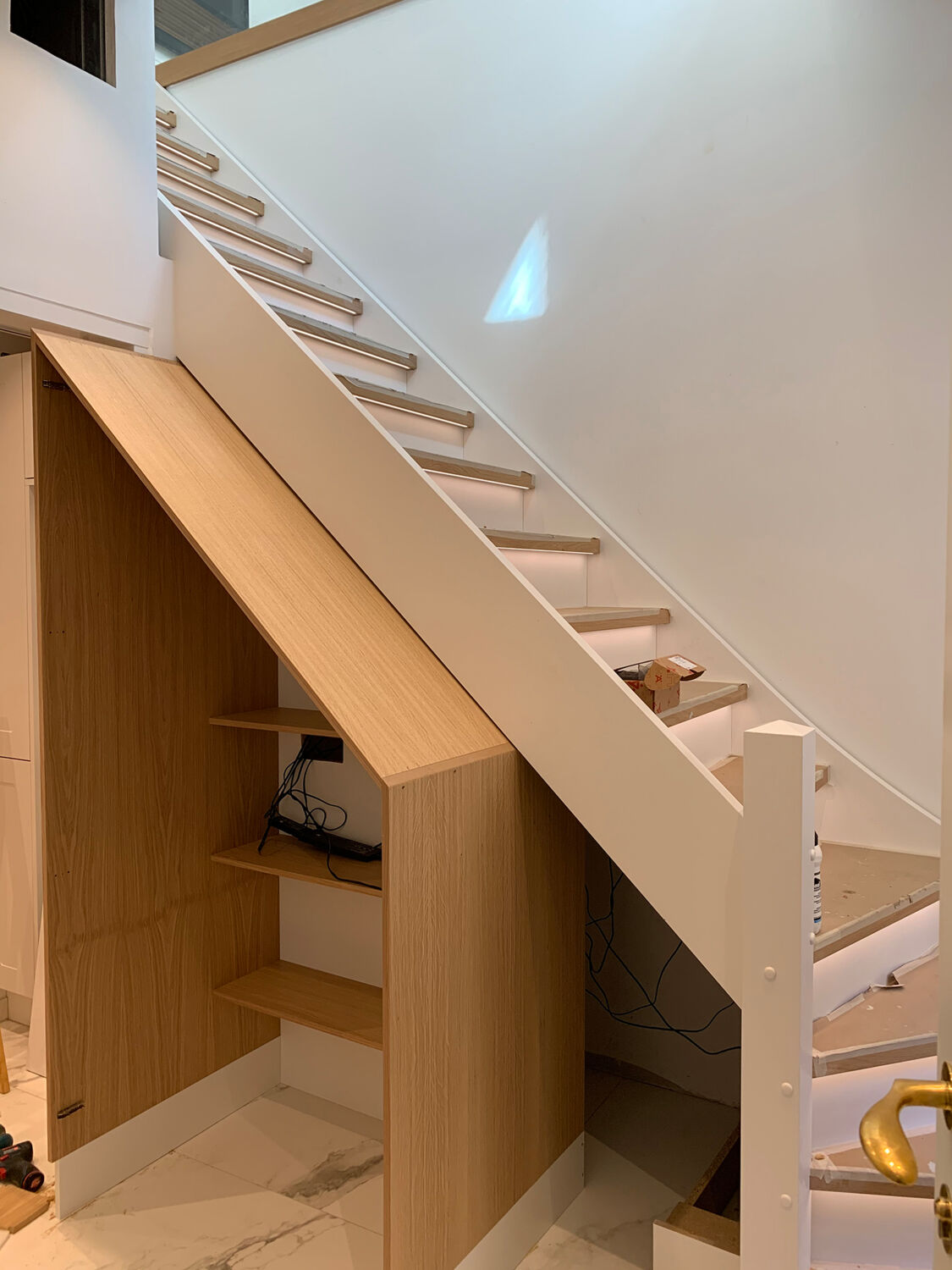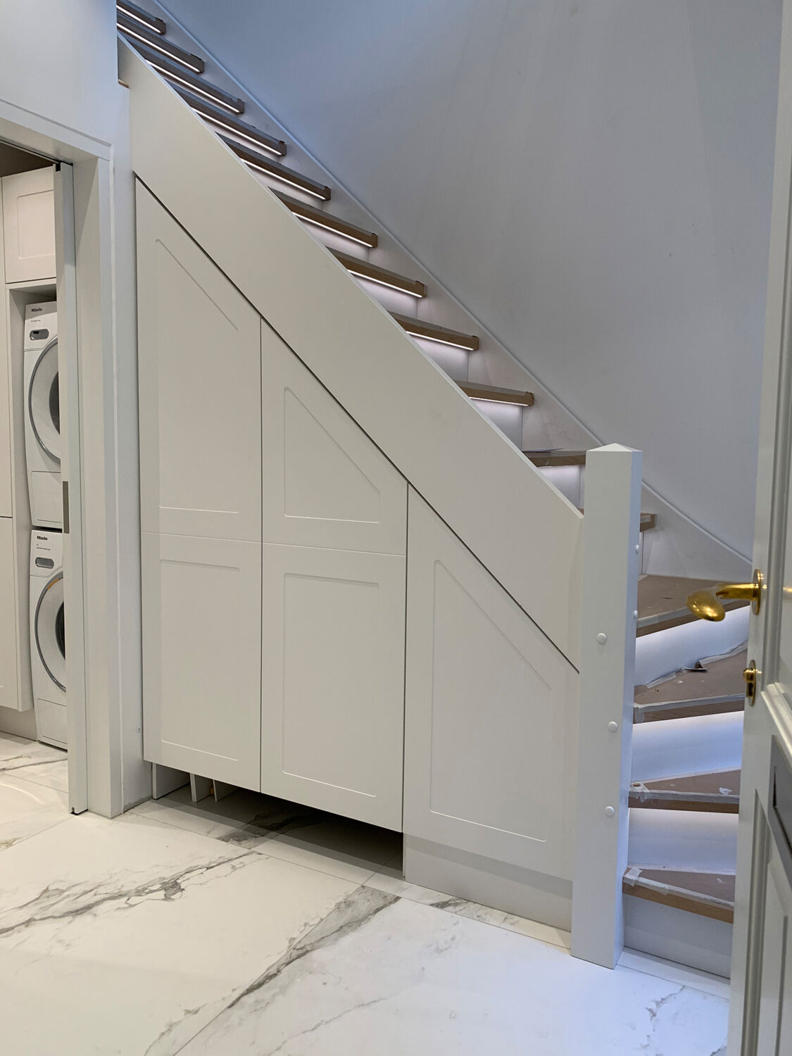 Til dette skønne hjem byggede vi en skabsvæg under trappen, samt stort skab fra gulv til loft i samme rum. Derudover udarbejdede vi sammen med kunden, et sminkebord, spejl, bænke og radiatorskjulere.