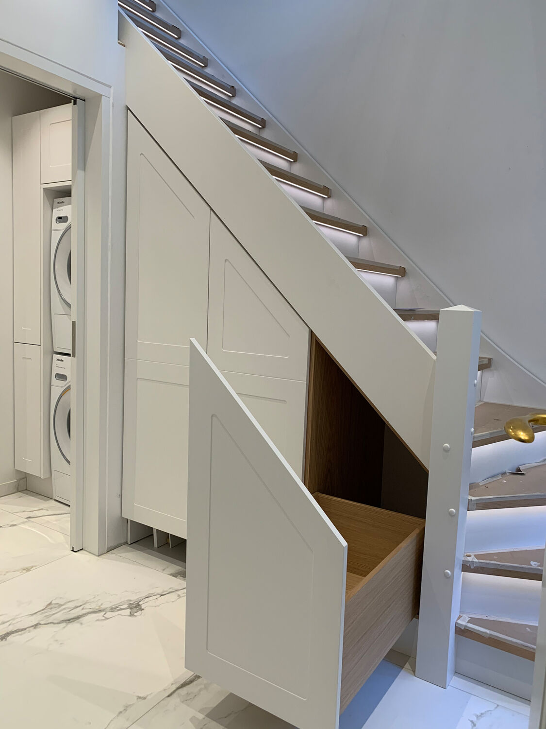 Trapper kan være meget mere end blot en funktion til at gå fra et niveau til et andet. Her kan blandt andet integreres skabe, hylder eller skuffer. Eller måske skal pladsen omkring trappen også i brug, med indbyggede opbevaringsløsninger langs trappens vægge. Helt optimalt – når hver kvadratmeter tæller.