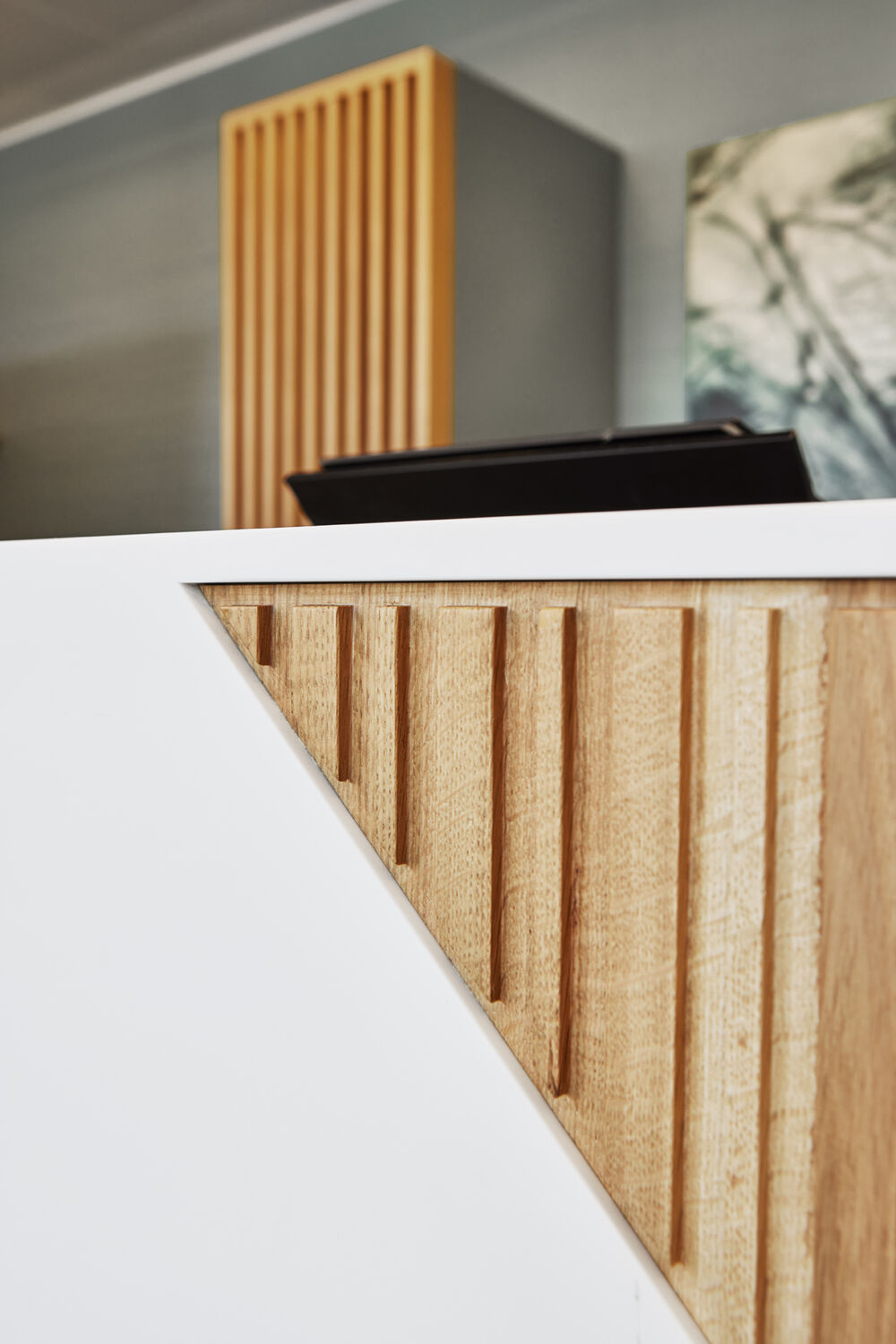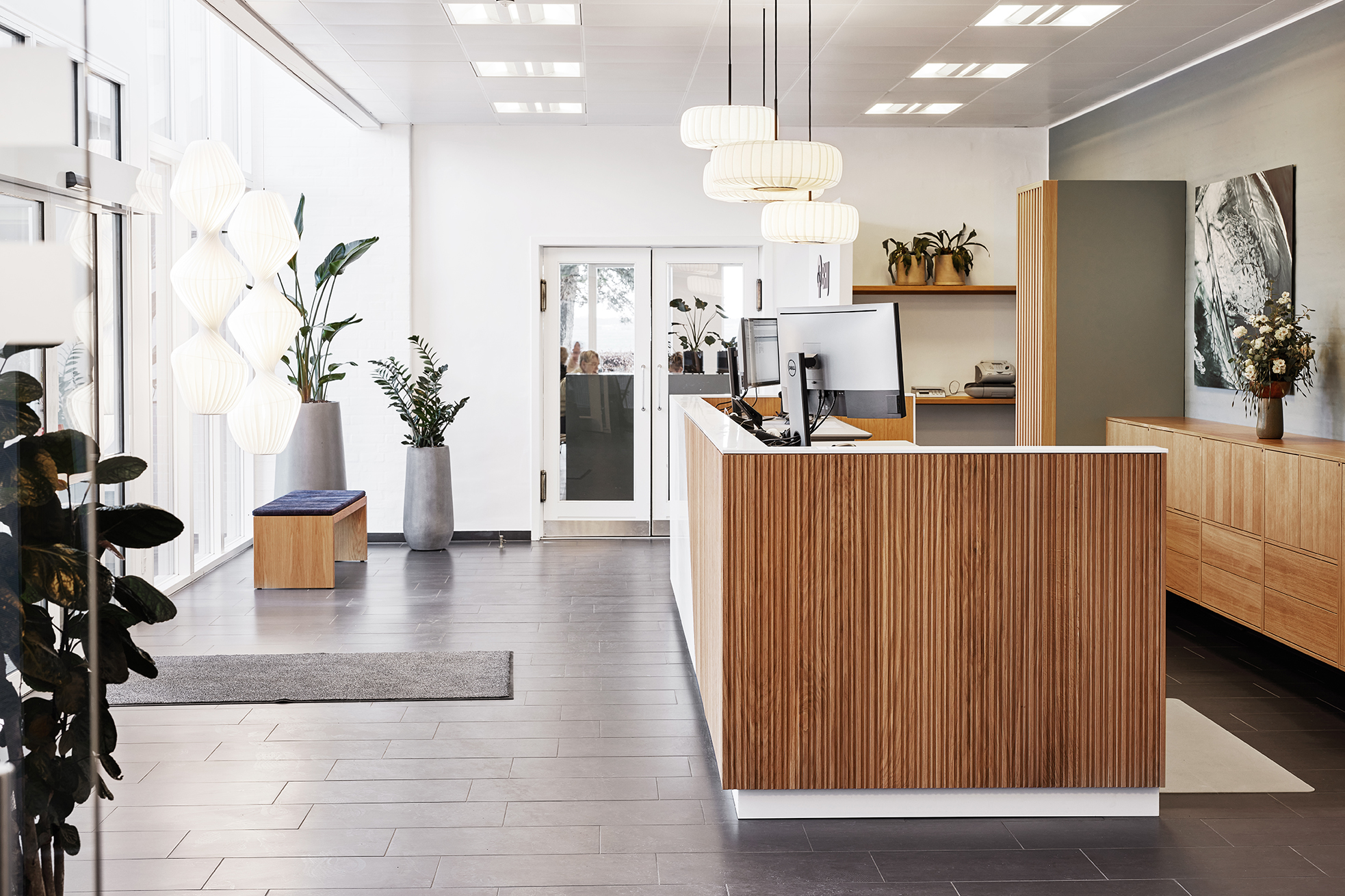 Receptionen fik en ny skranke fremstillet af hvid Corian og massiv eg. Og gennemgående i virksomheden har vi sammen med Arkitekt & rum, arbejdet på at give medarbejderne en funktionel hverdag med god opbevaring, praktiske løsninger, siddepladser og hyggelig stemning.