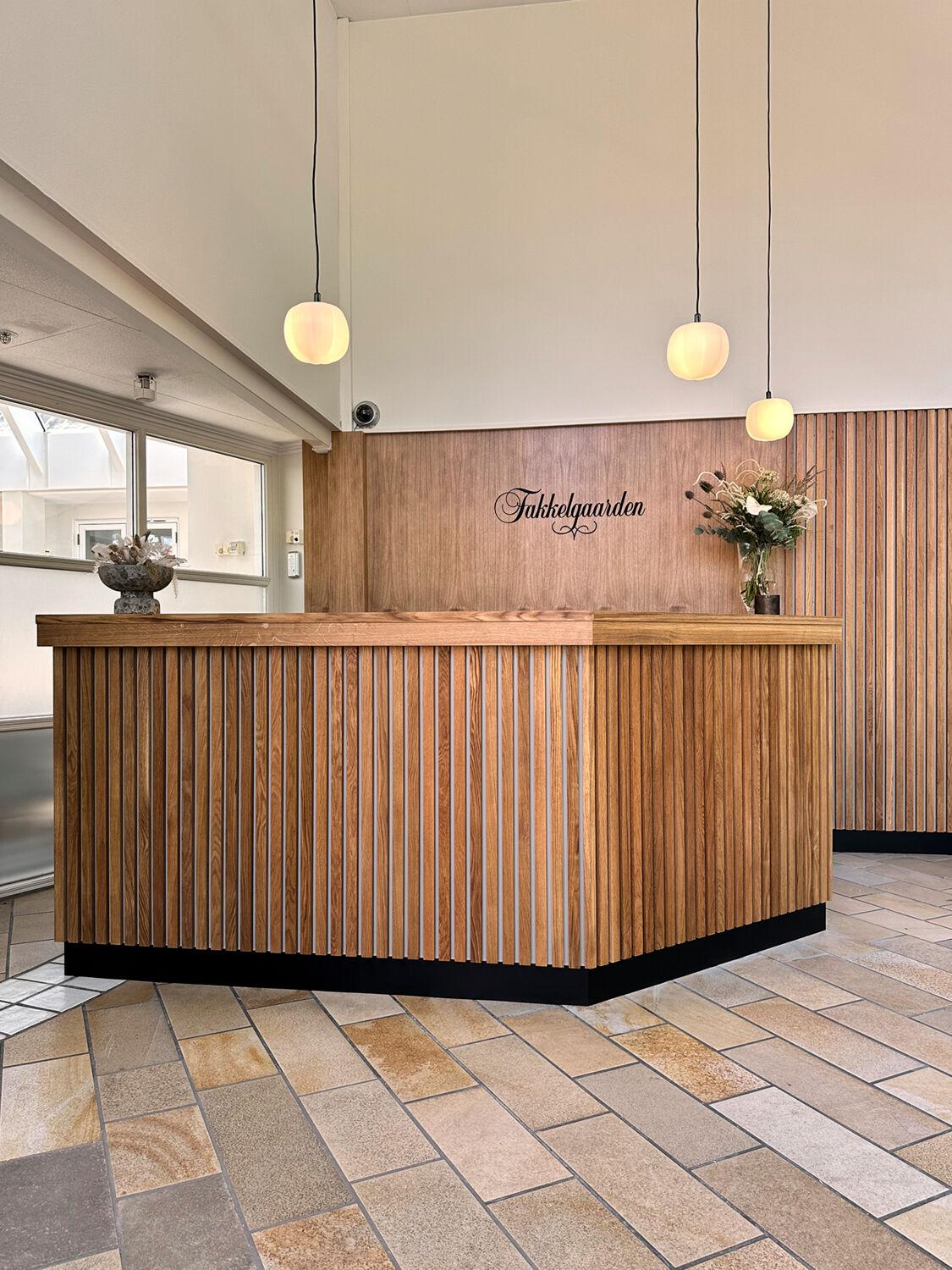 Vi har haft fornøjelsen af at levere specialfremstillede elementer til Fakkelgården, et hyggeligt og velbesøgt hotel og restaurant i Kollund. Som en del af projektet har vi fineret og lakeret pladen bag deres receptionsskranke, hvilket giver et elegant og poleret udseende, der komplementerer stedets stilfulde indretning. Derudover har vi leveret et udskåret logo, som tilfører en unik visuel identitet til skrankeområdet.