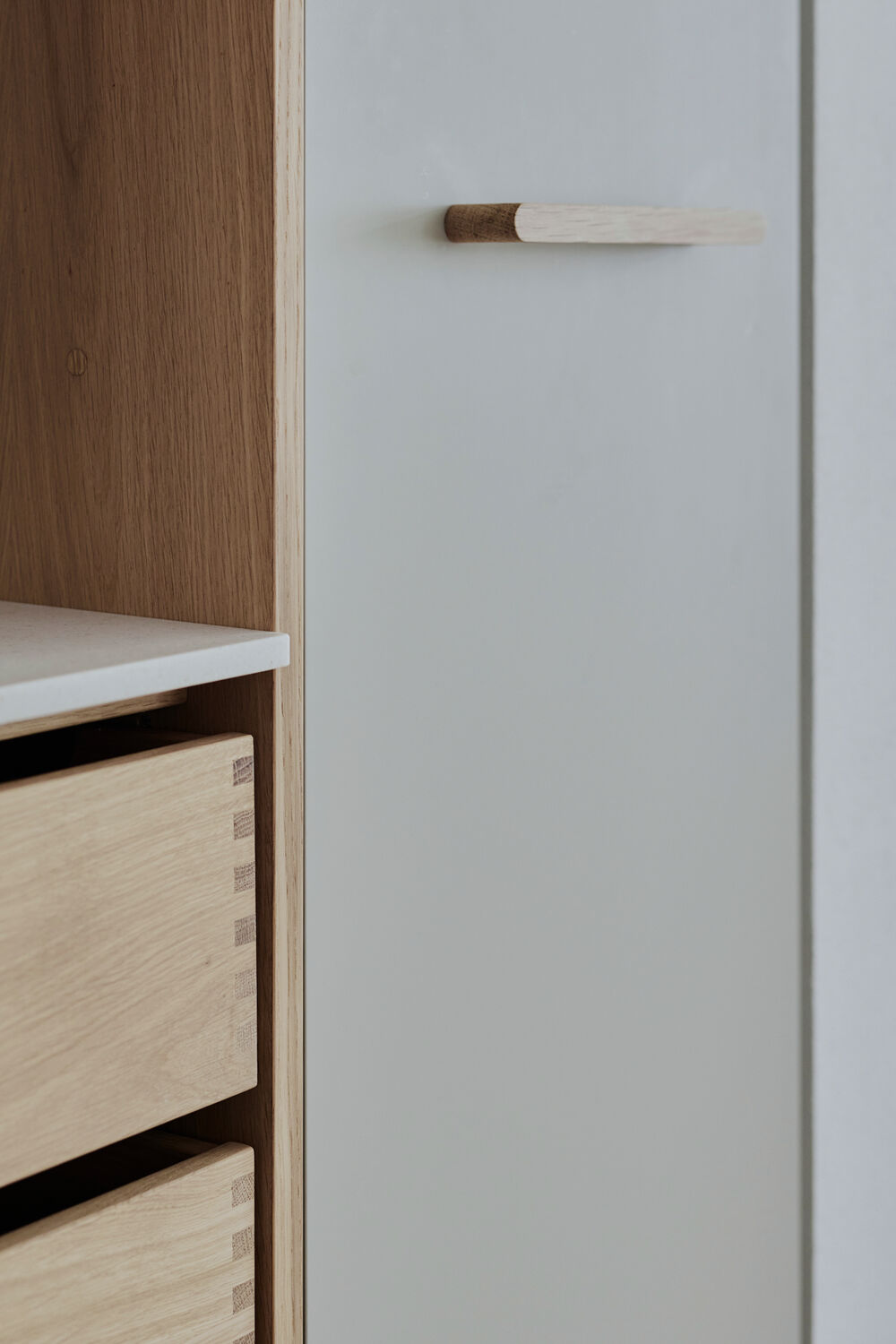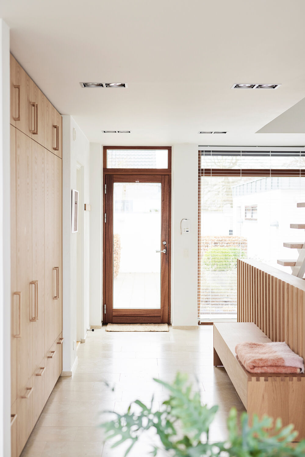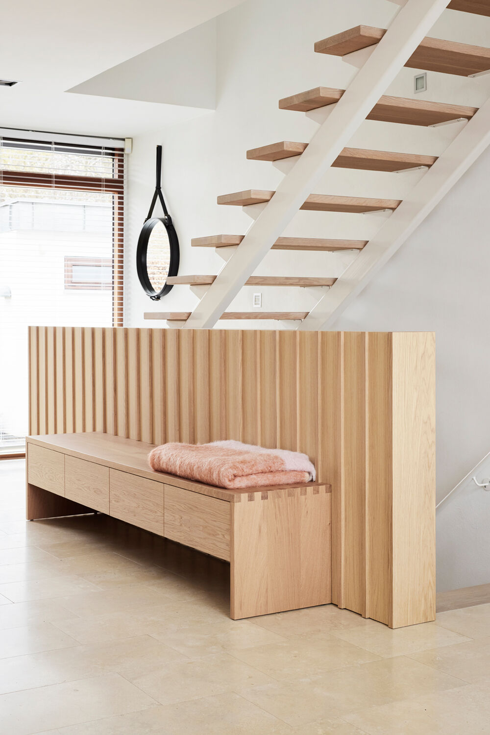 I forlængelse af køkkenet byder entreen på masser af opbevaringsplads og en kombineret bænk og lav væg med massive egetræslister, der fungerer som rumdeler mellem entre og trappe. Bænken er udført i massiv eg med fingertappede samlinger og fingertappede egetræsskuffer.