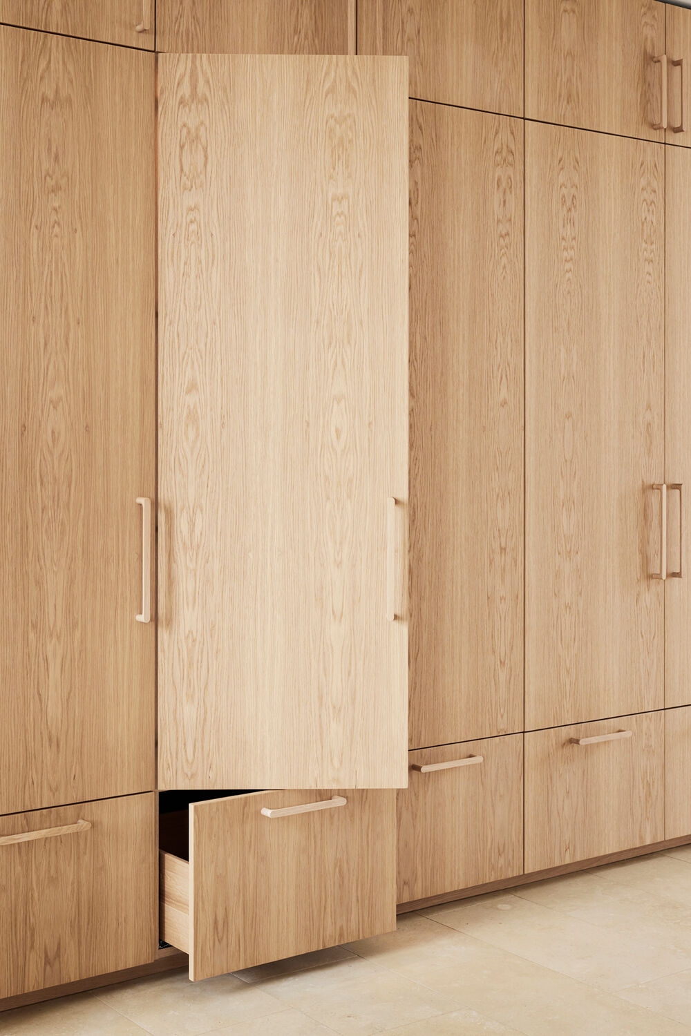 Tidløst køkken i eg og Corian med gennemtænkte detaljer.