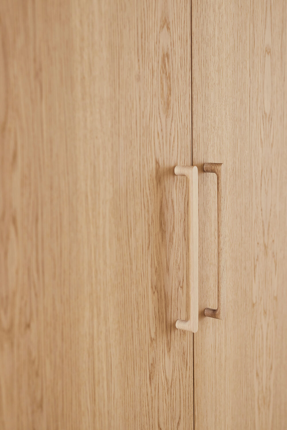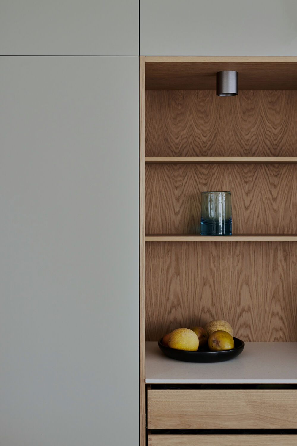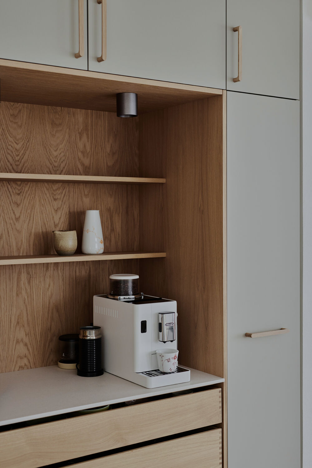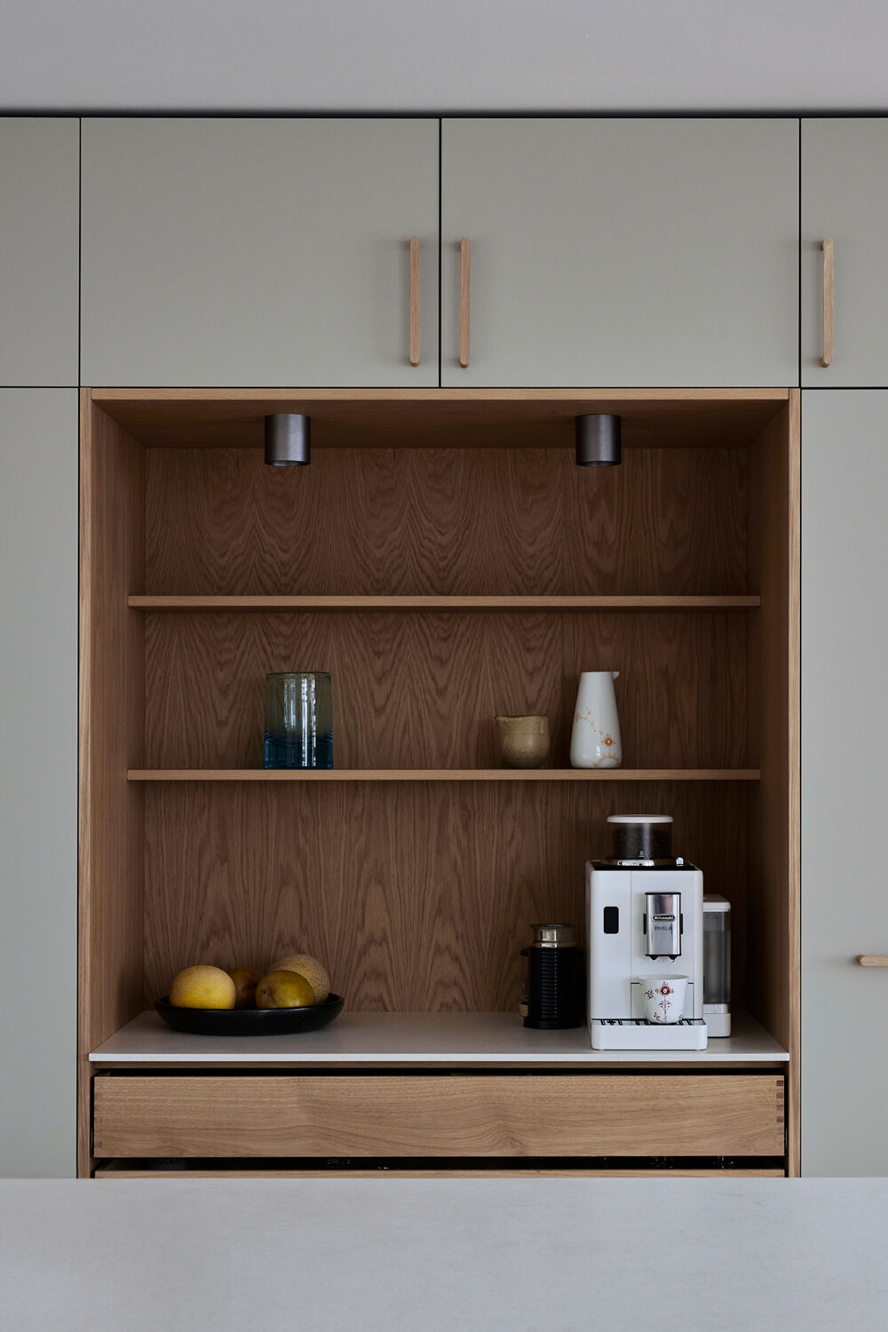 En åben egetræsniche i skabsvæggen rummer familiens kaffesektion med indbyggede LED-lys under hylderne, så der både er praktisk og hyggelig belysning i nichen. Lyset styres med en diskret, integreret tænd/sluk-knap, skjult i skabets konstruktion.