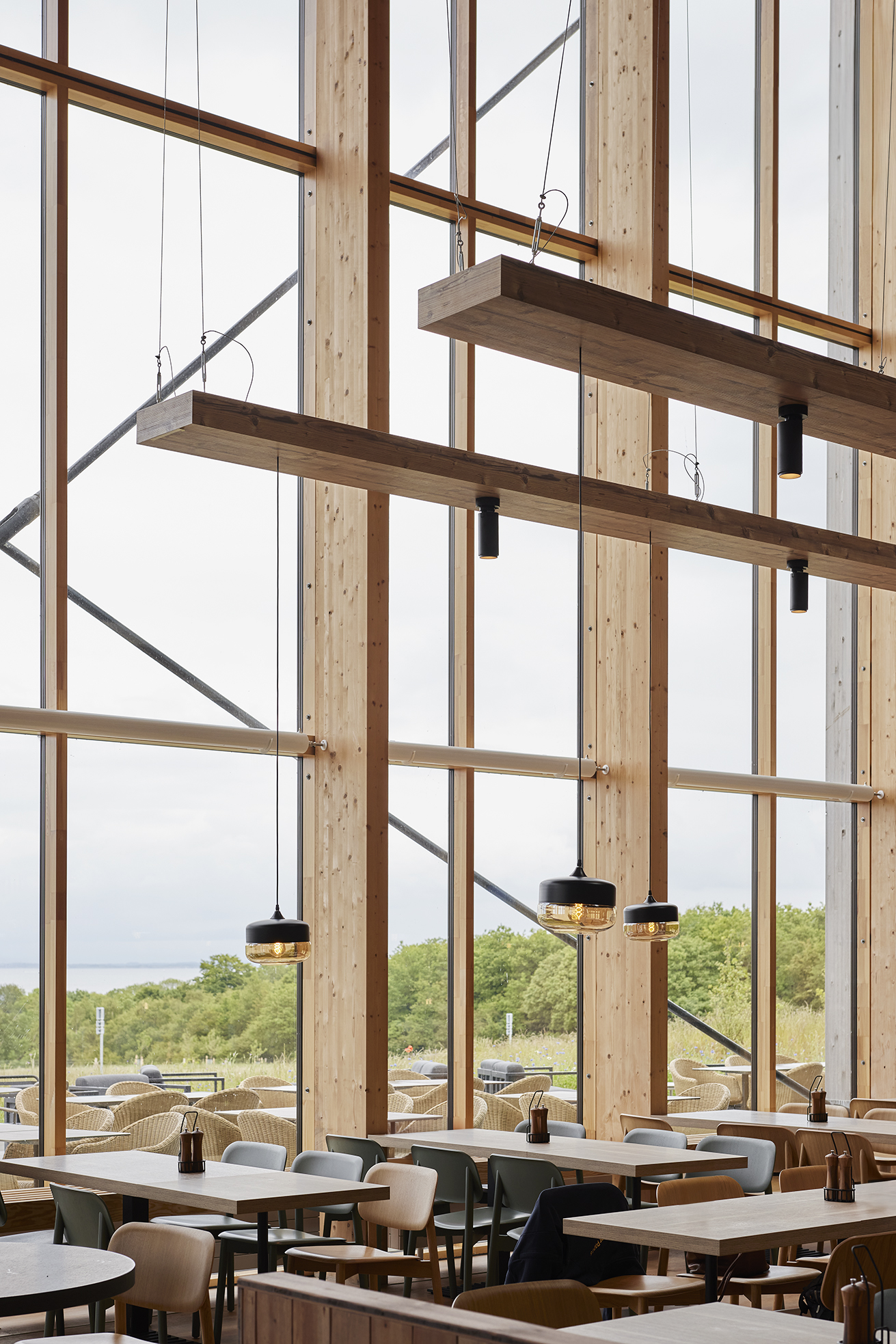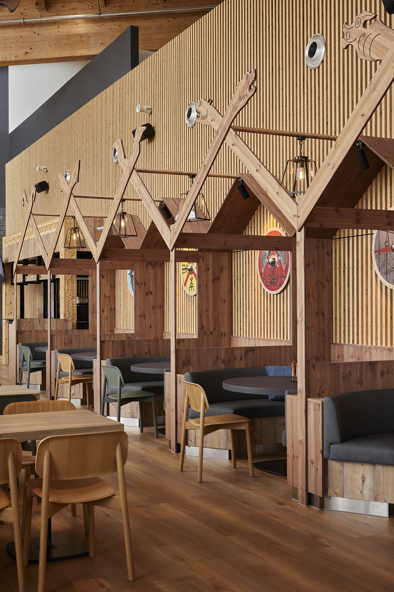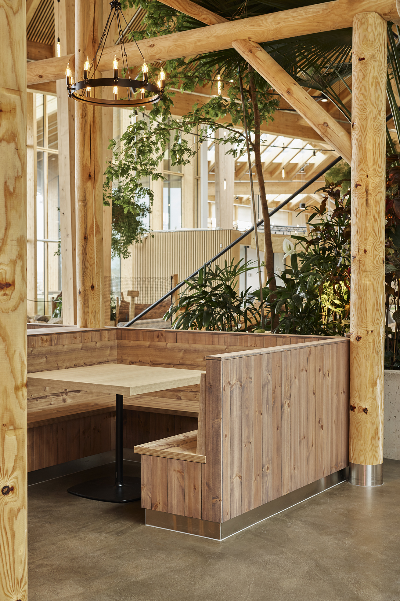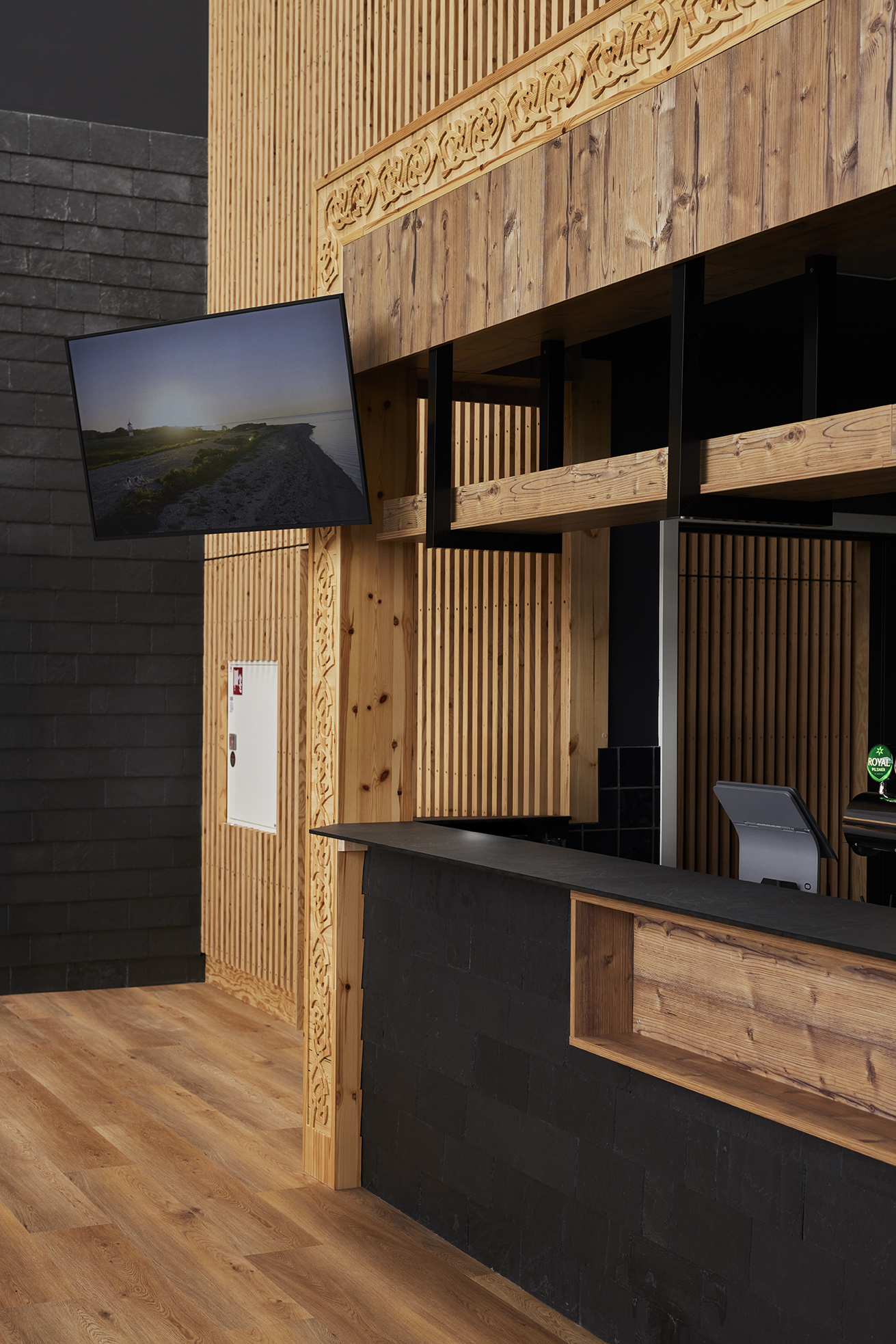 I restaurantområdet har vi leveret en kombination af faste bænkeløsninger, facadebeklædning, lampeophæng samt barreoler med integreret belysning.