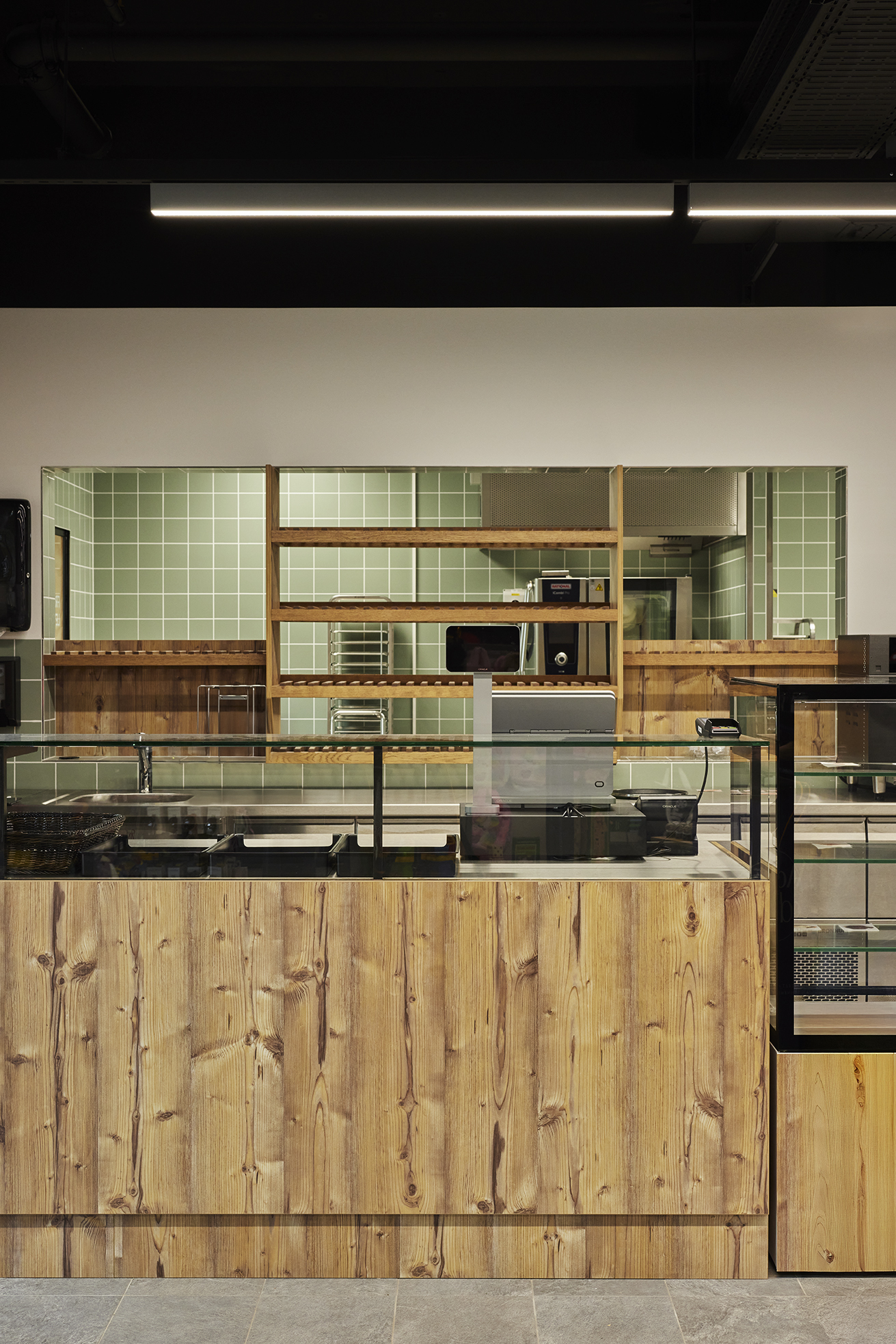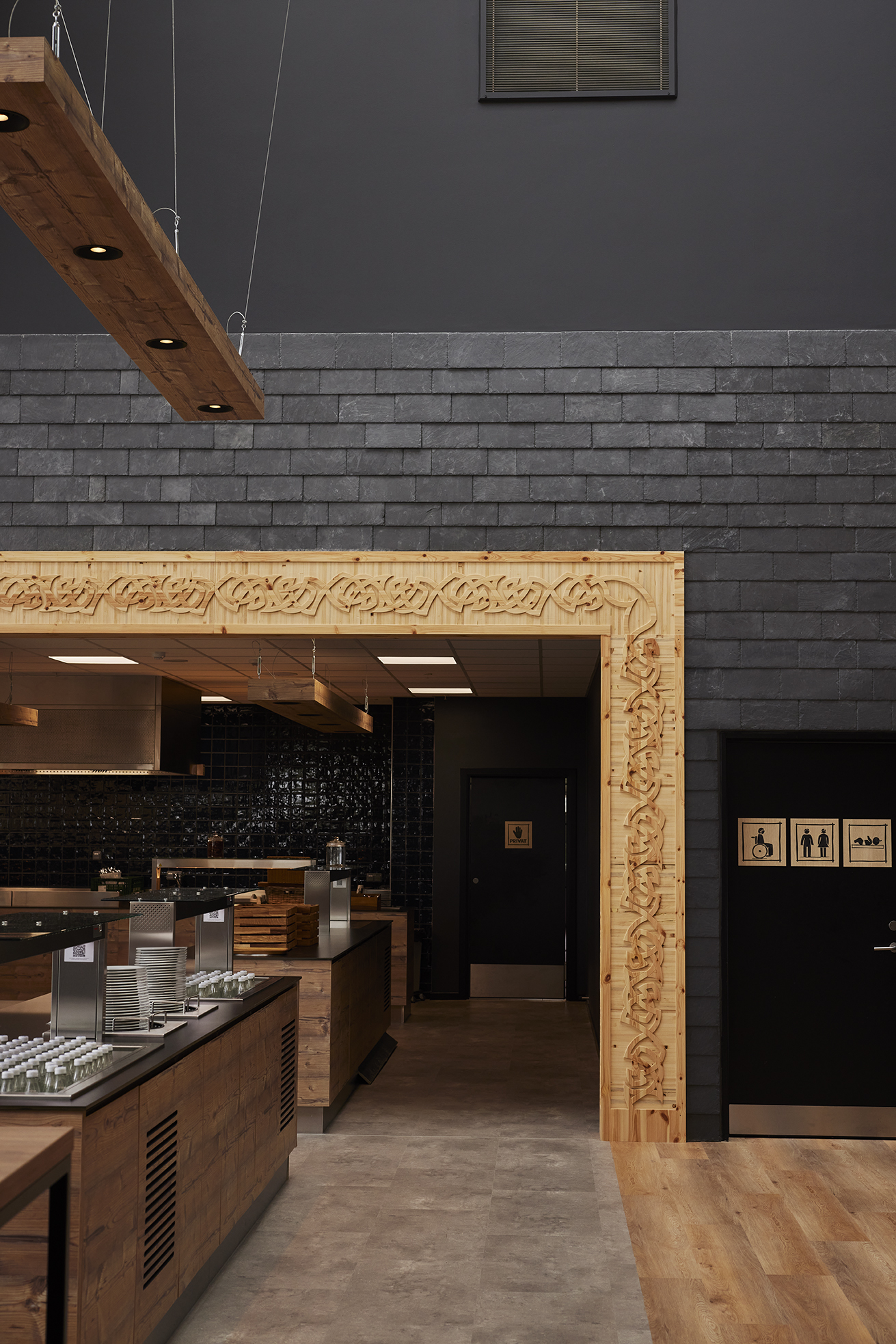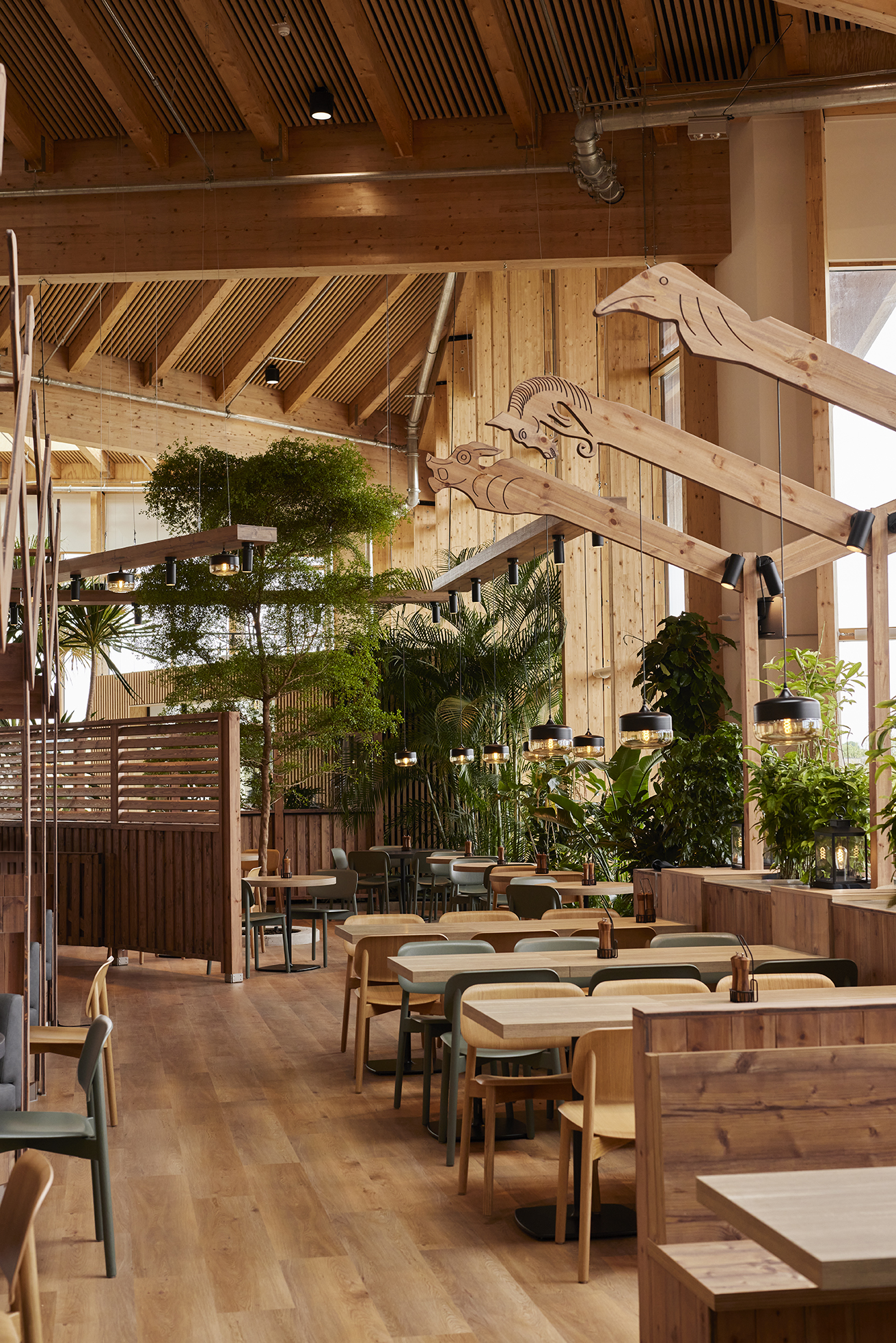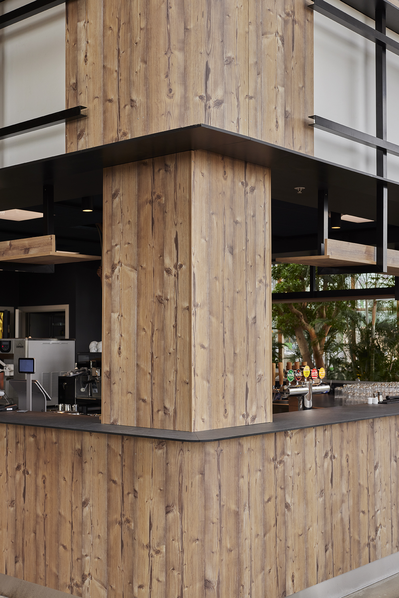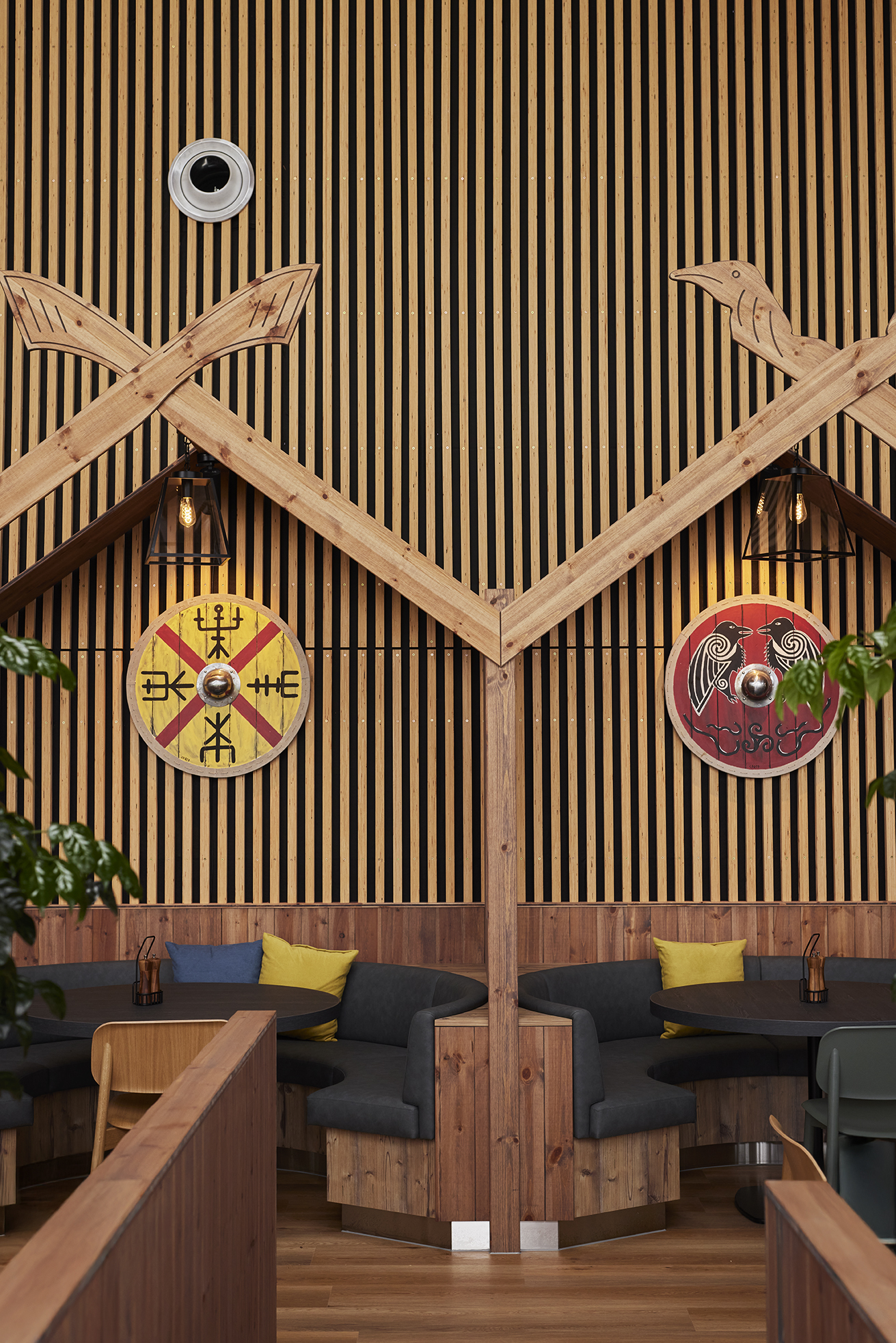 I restaurantområdet har vi leveret en kombination af faste bænkeløsninger, facadebeklædning, lampeophæng samt barreoler med integreret belysning.