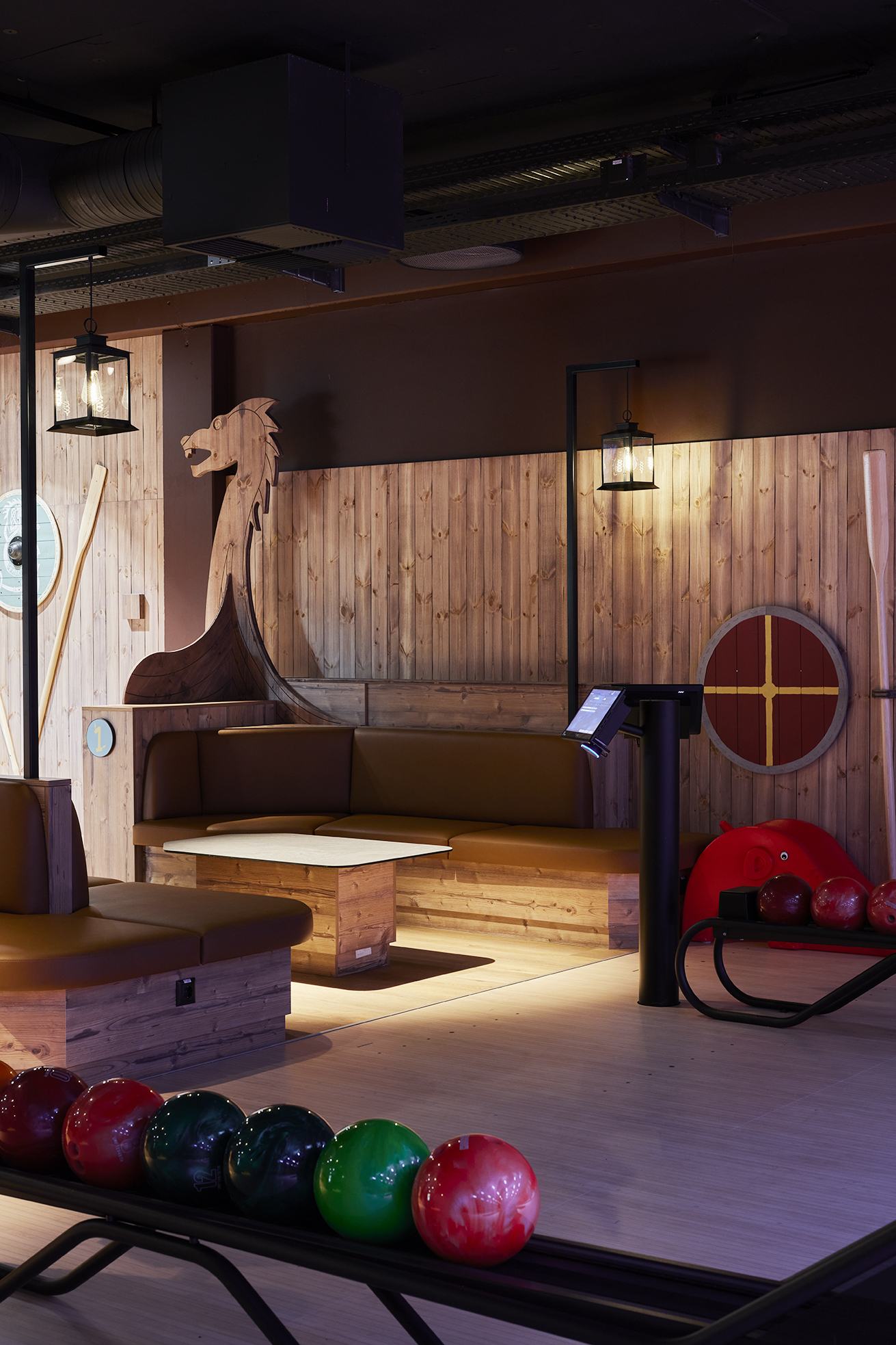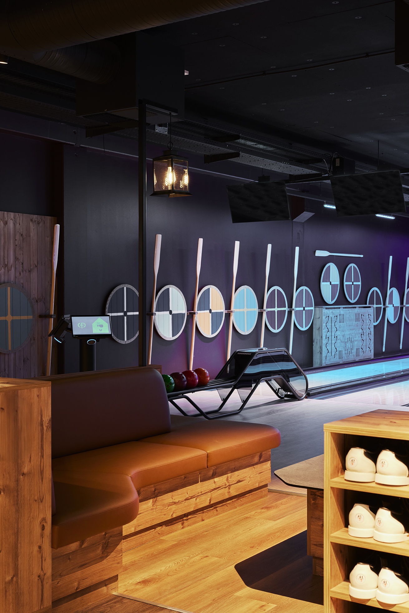 Vi har opført inventar i bowlingområdet med fokus på robuste materialer og legende detaljer, der understøtter stedets tema. Herunder indbygget belysning, vægbeklædning og bænkpladser.