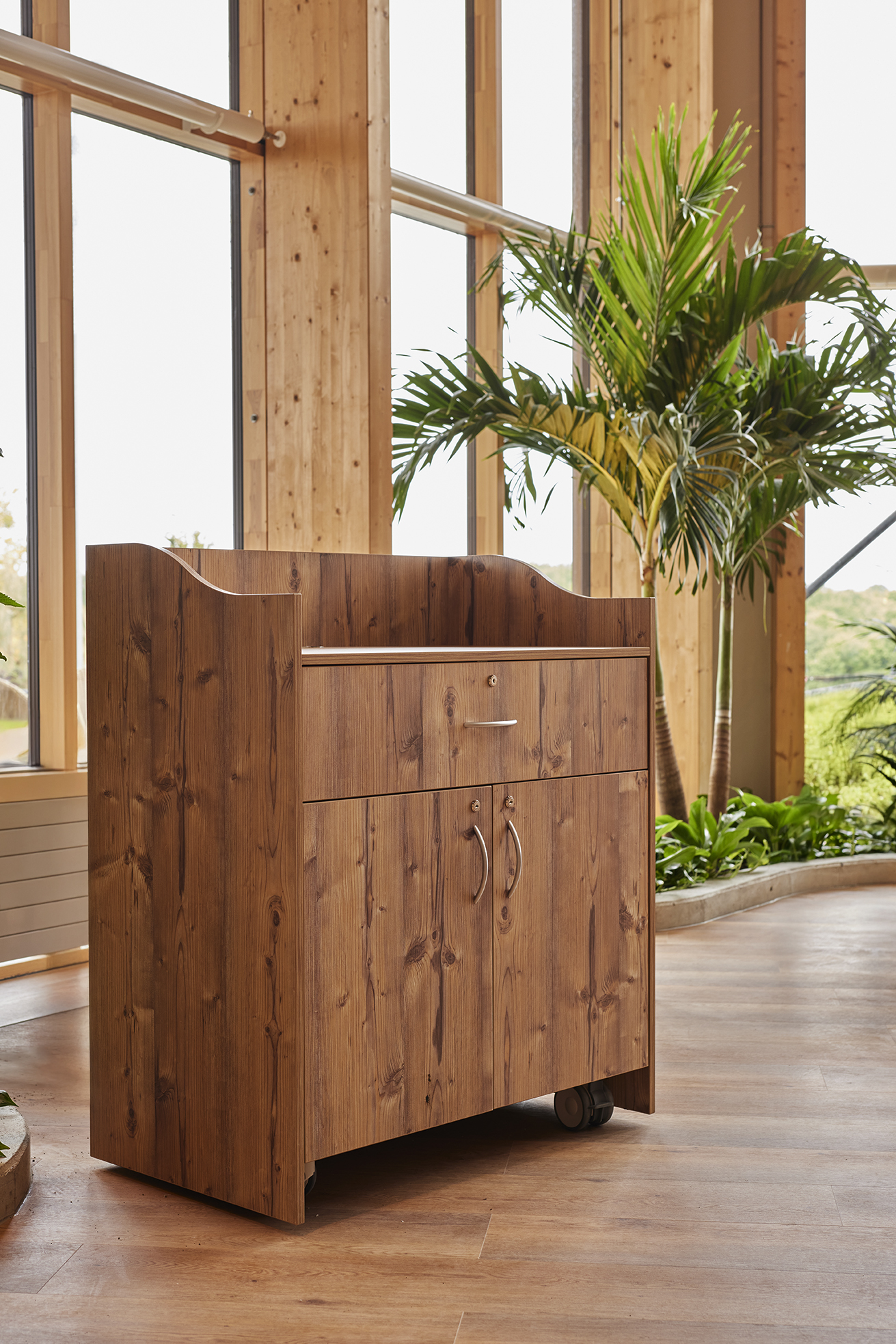 Receptionen er opført med fleksible diske, der kan tilpasses siddende eller stående betjening. Skabe og baldakin er udført i samme træsort, hvilket sikrer et roligt og ensartet udtryk.