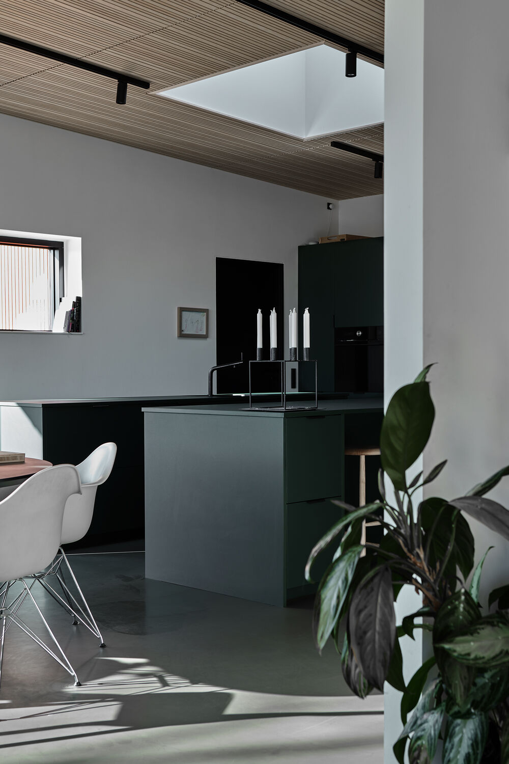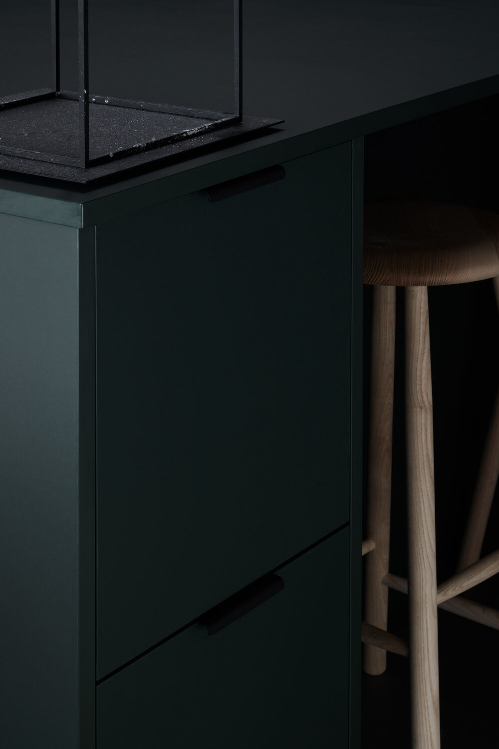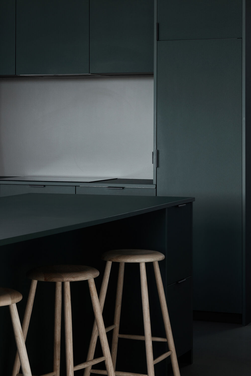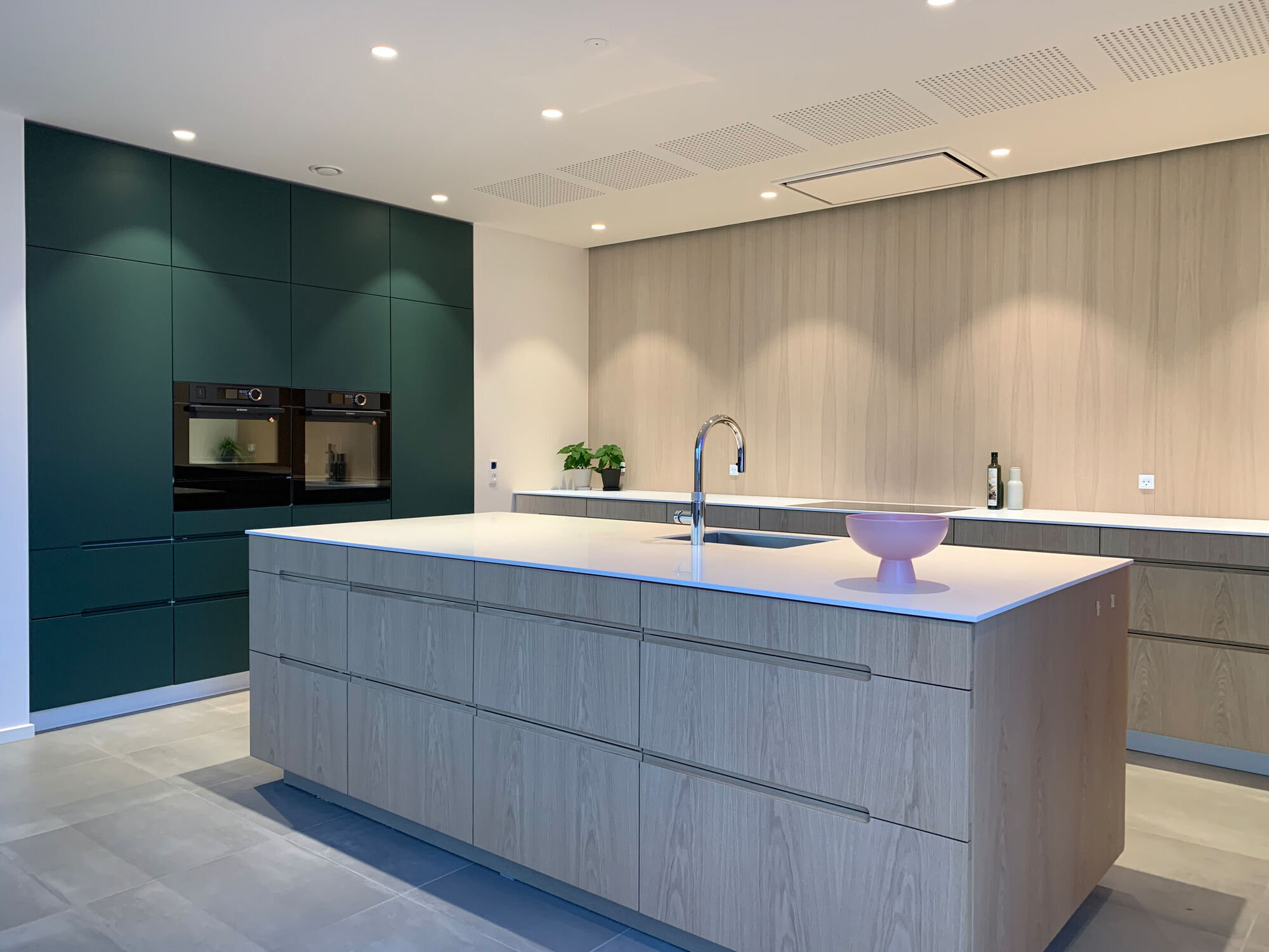 Til dette fine køkken har vi fremstillet specialtilpassede køkkenfronter i smukt, grønt linoleum, der kombinerer elegance og holdbarhed. Linoleum er et slidstærkt materiale, der både er behageligt at røre ved og let at vedligeholde – perfekt til moderne køkkener.