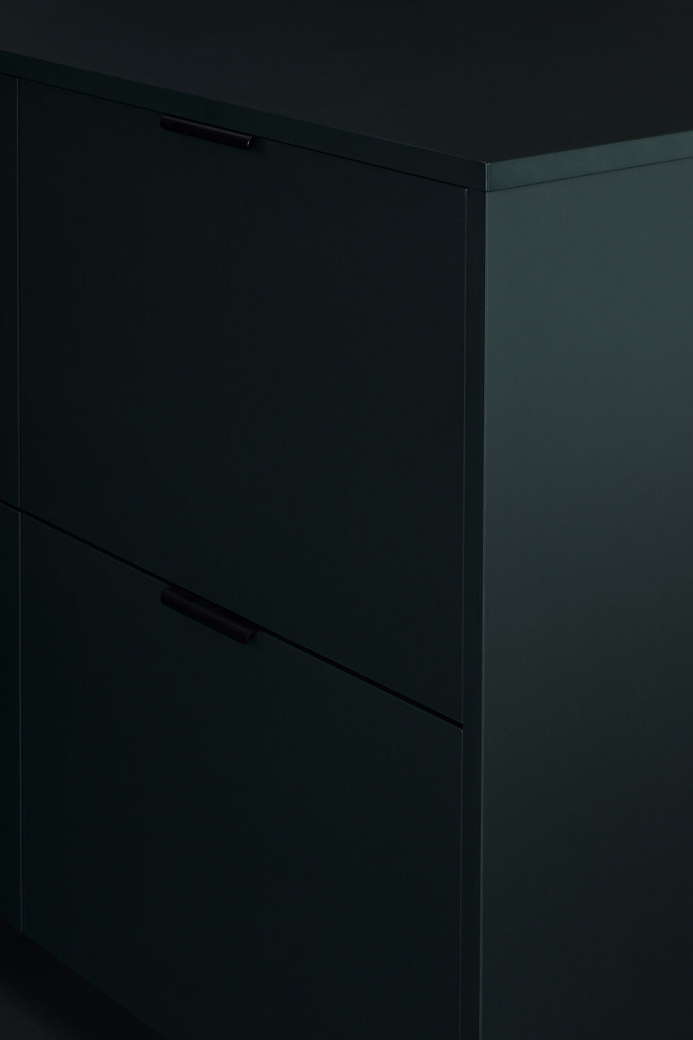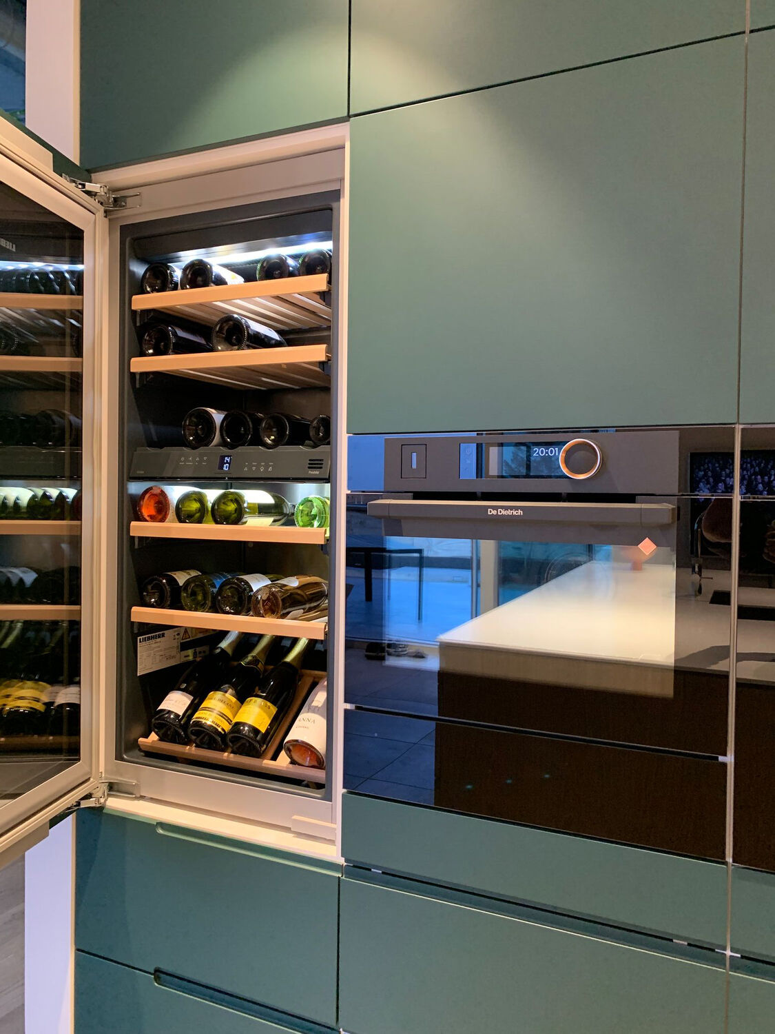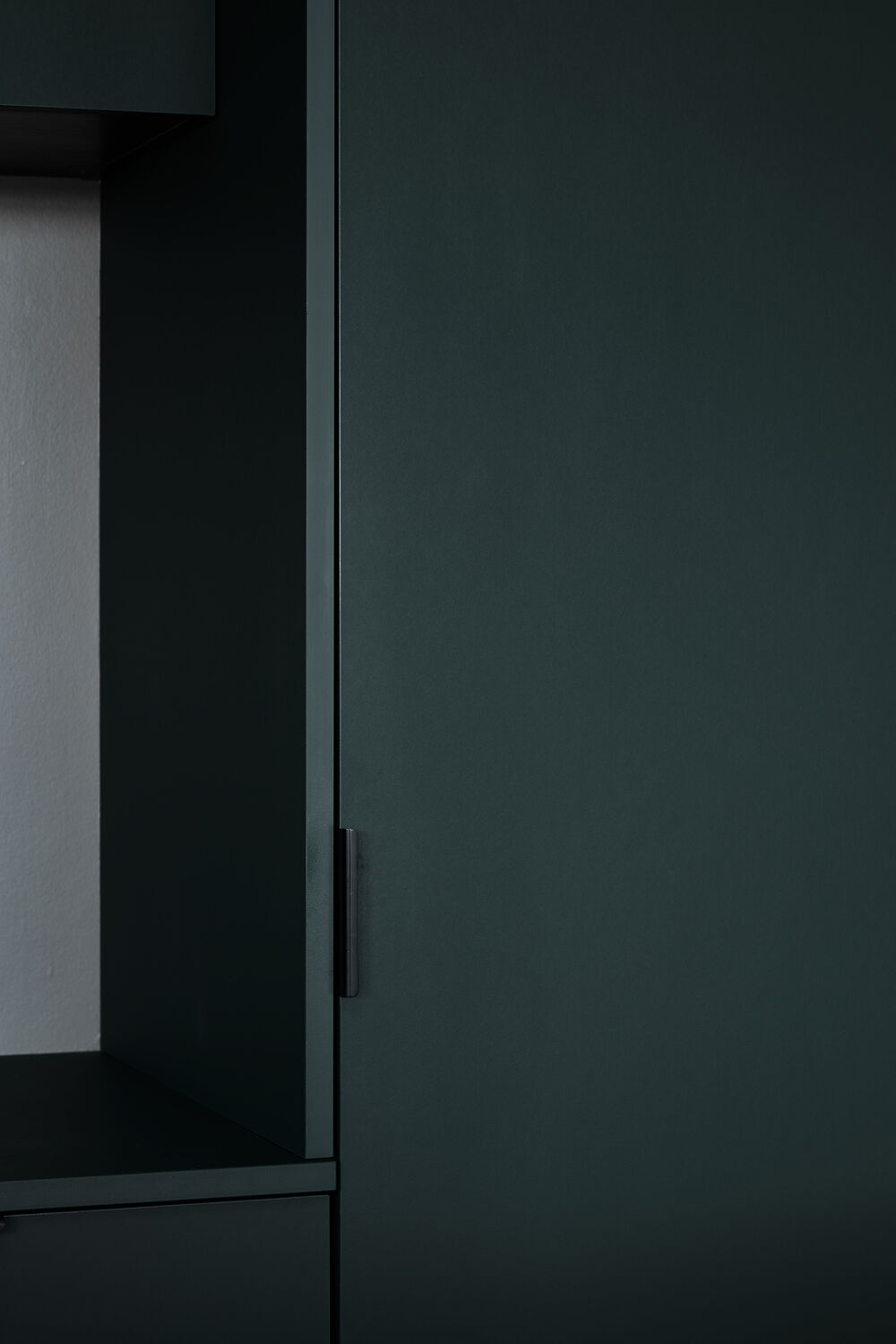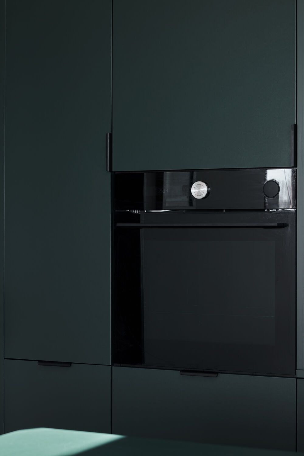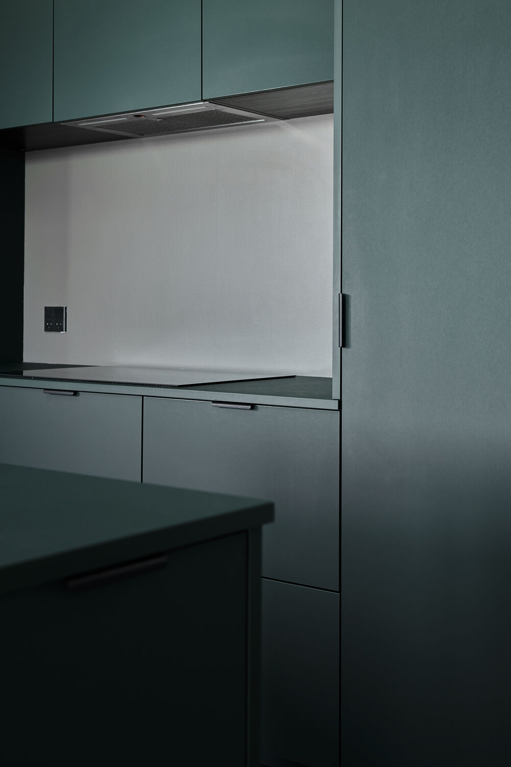 Til dette fine køkken har vi fremstillet specialtilpassede køkkenfronter i smukt, grønt linoleum, der kombinerer elegance og holdbarhed. Linoleum er et slidstærkt materiale, der både er behageligt at røre ved og let at vedligeholde – perfekt til moderne køkkener.