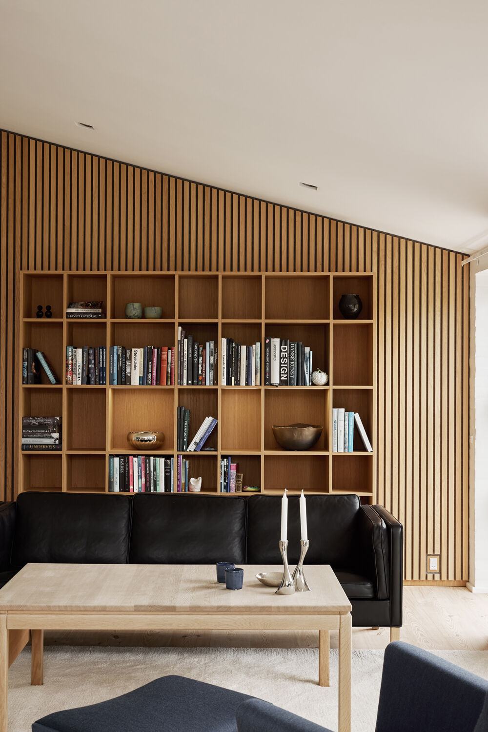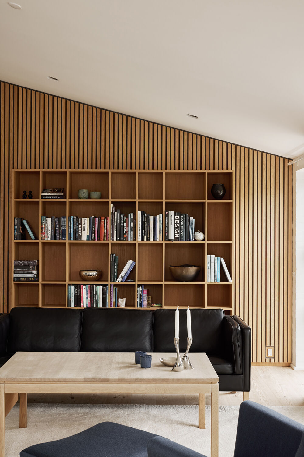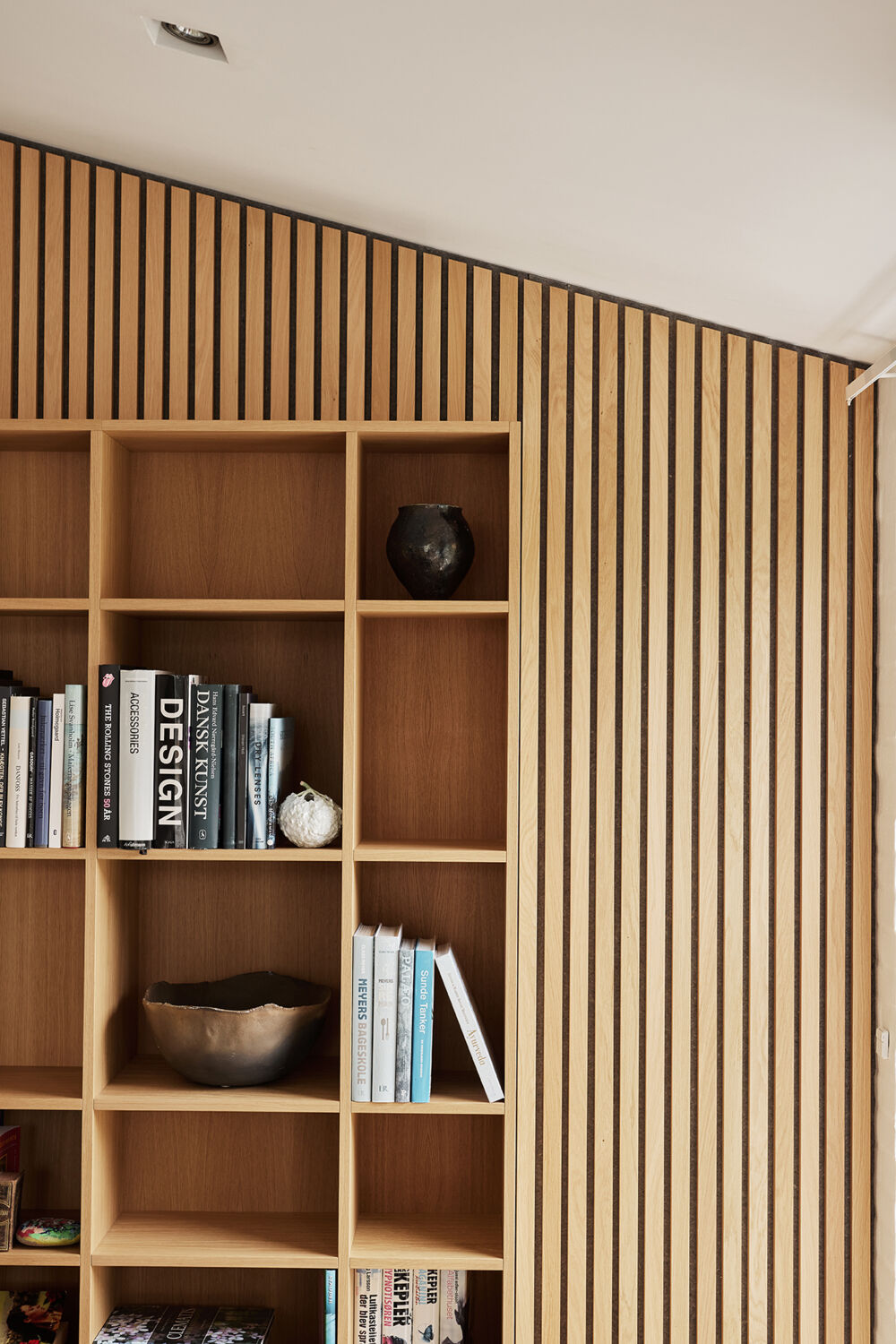 Til dette private hjem byggede vi en vægreol der er integreret ind i en lamelvæg. I rummet er der højt til loftet, hvilket til tider kan udfordre akustikken og dermed også familiens brug af rummet. Med en praktisk reol og akustikpanel, fik familien ikke bare optimeret rummets funktionalitet, men de fik også tilføjet en ro, varme og god opbevaringsløsning.