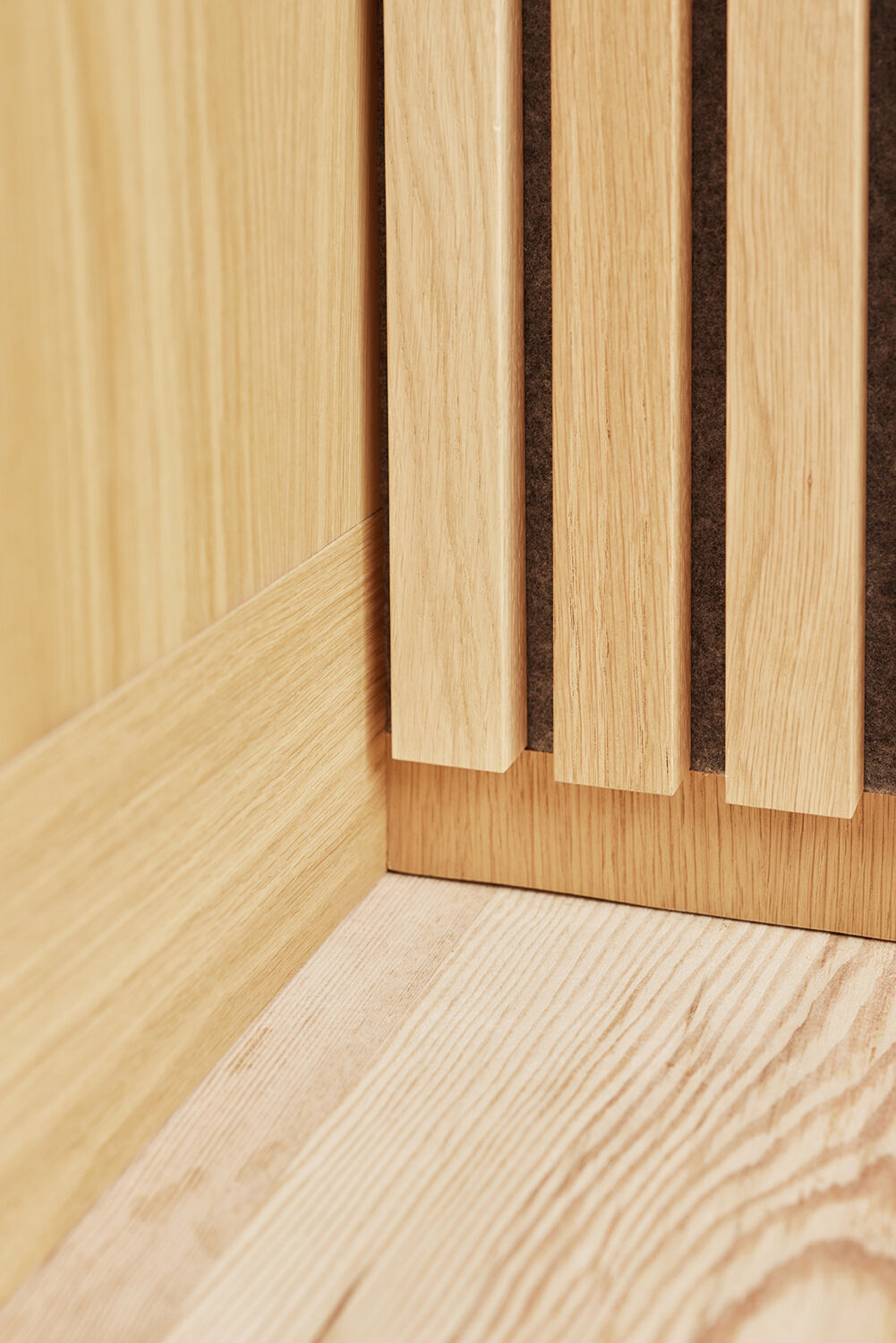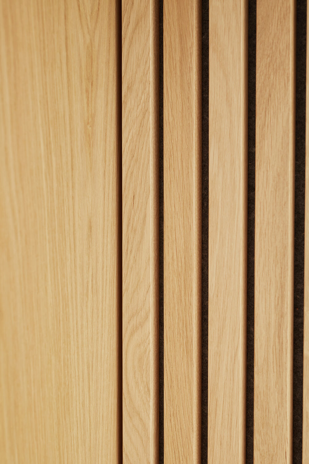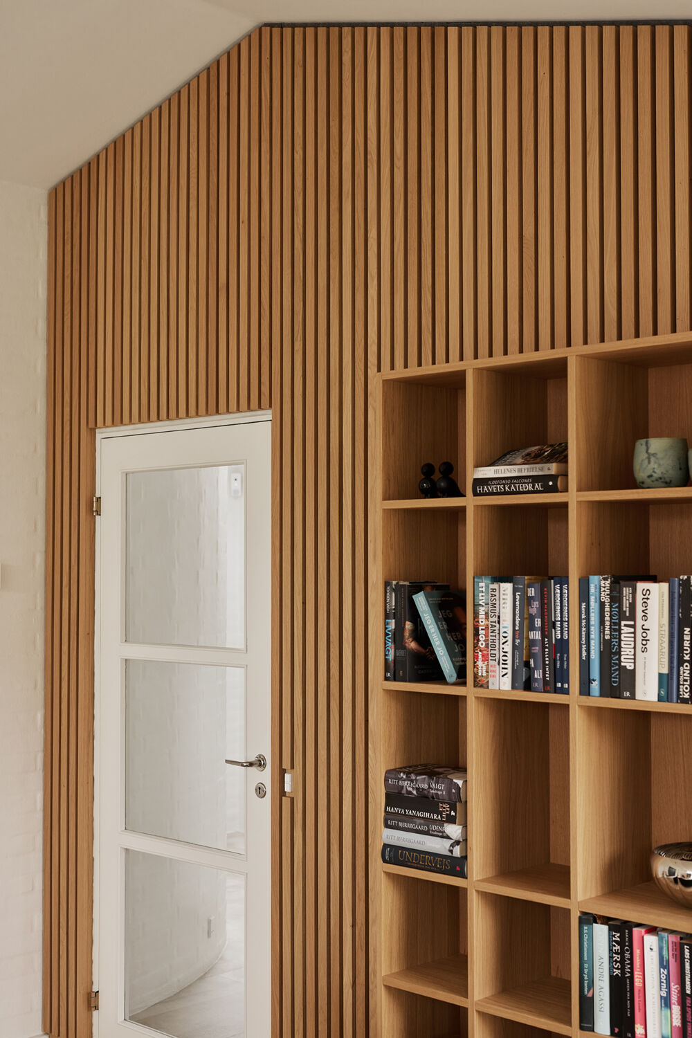 Til dette private hjem byggede vi en vægreol der er integreret ind i en lamelvæg. I rummet er der højt til loftet, hvilket til tider kan udfordre akustikken og dermed også familiens brug af rummet. Med en praktisk reol og akustikpanel, fik familien ikke bare optimeret rummets funktionalitet, men de fik også tilføjet en ro, varme og god opbevaringsløsning.